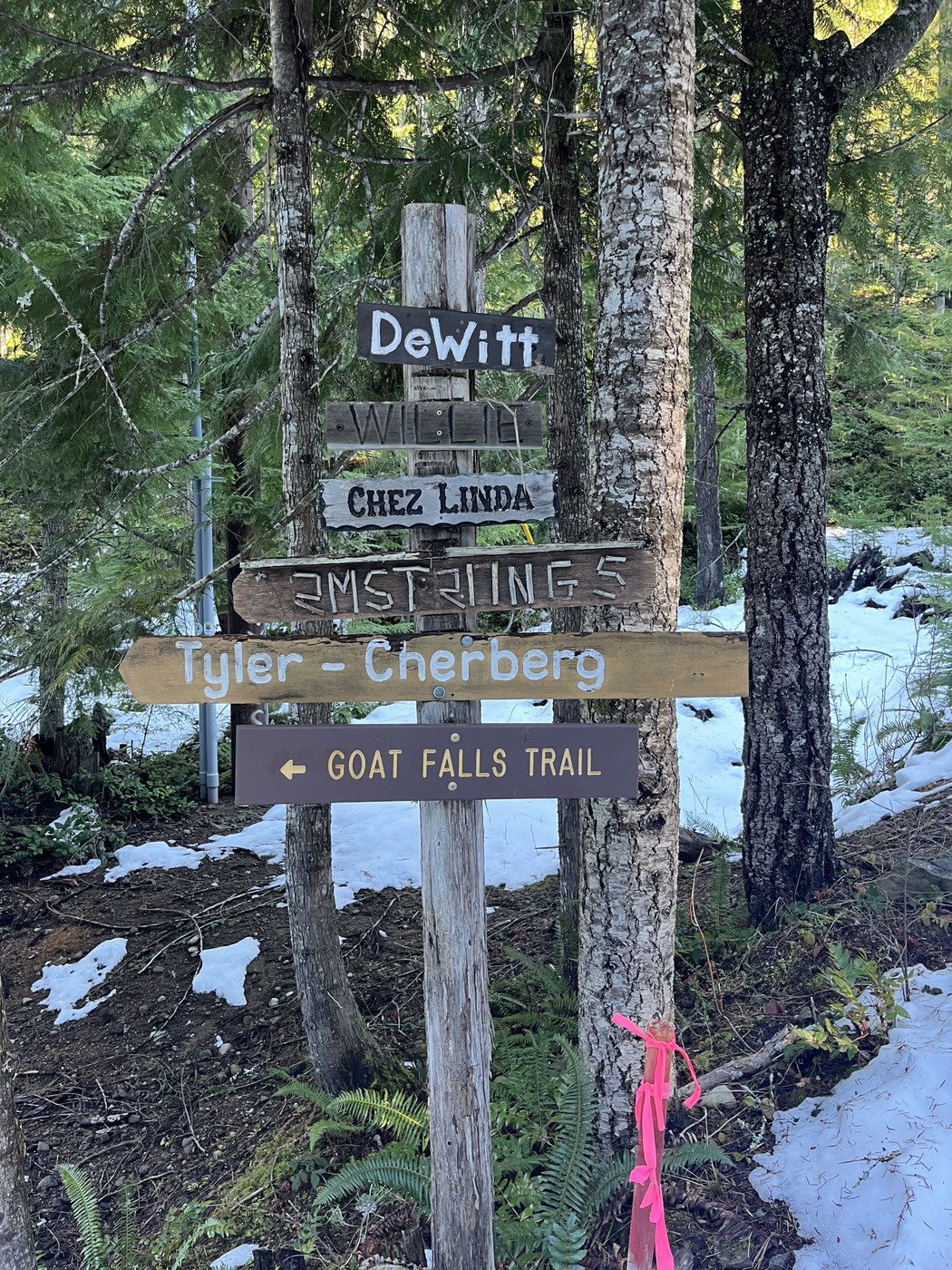 A bunch of trees fell across the trail when you are within sight of Goat Falls. Given our companion (dog), the two humans decided not to push through it.