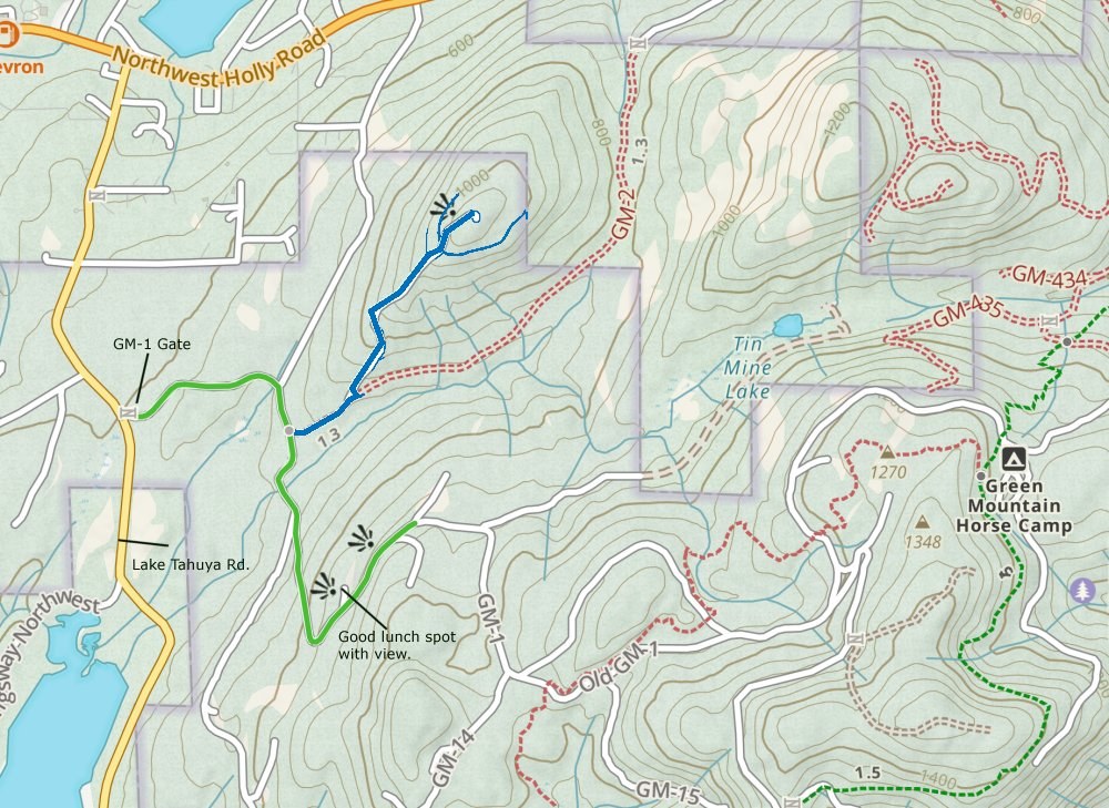 We are exploring the many logging and other roads on the W side of Green Mtn beginning at the GM-1 gate off Lake Tahuya Rd.