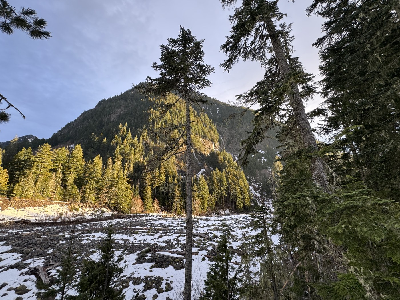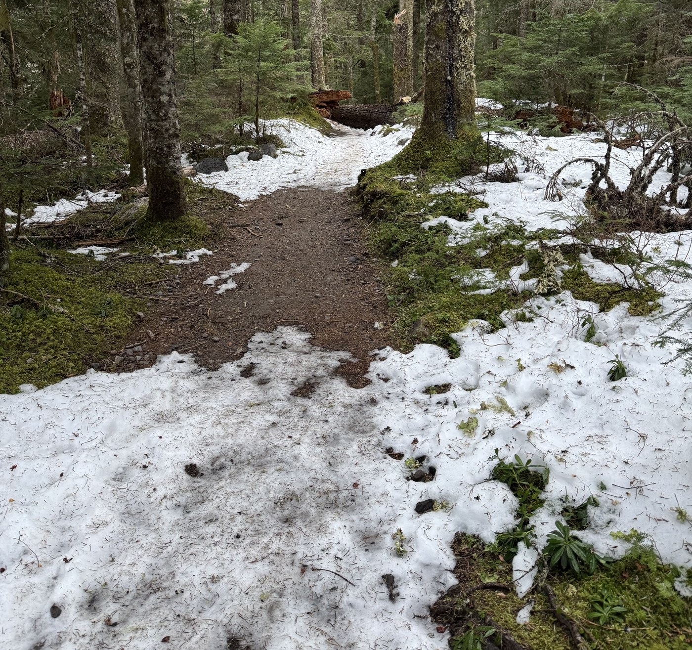 Snowshoe this was not. There were patches of snow that was slightly slushy and mostly not slippery. We wound up putting on spikes about a mile in, figuring the snow was going to become more consistent, but it was still patchy after that, and if you're reasonably sure on your feet you can probably make it in regular shoes/boots. The temperature was above freezing (37F at the parking lot according to my car), so there wasn't much ice (a couple of places where water had flowed along the trail). I suspect it would be significantly more slippery if it were below freezing.