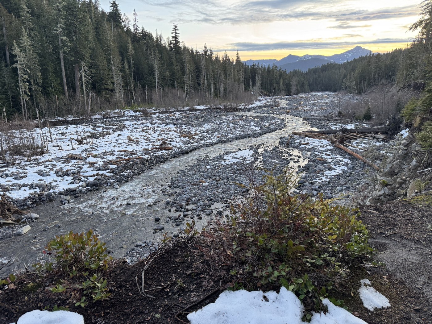 There's a gate just past Longmire for the way up toward Paradise that closed at 3pm for the way up and 4pm for the way down, so Longmire is a good choice of starting point if it's late in the day (like it was for us) as there aren't nightly closures on the way out. No snow at all on the road or in the parking lot (thanks to plowing; there were piles on the side in places).