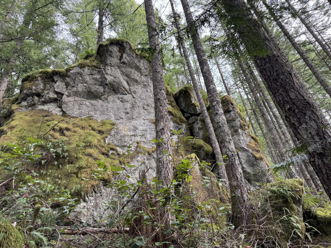 My hiking group started from Teneriffe trailhead and hiked on the base of Mount & Little Si to a mossy rocky outcropping we call Moss Vista for a 7.8 Mile hike today. Only 1 other car was in the TH lot when we started out at 9:30. It was 44 degrees with partially cloudy skies. The bathroom facility was open and clean. The entire route was hard packed soil, some with a cushion duff of needles and other areas rocky. We followed Mount Teneriffe, Roaring Creek, Mt Si , Douglas Fir and Boulder Garden Loop trails for an out and back hike. After the recent cold spell the ground has warmed up and there was no evidence of icy or frost heaves. Trail traffic was really light, except a short section of the Mt Si trail where we met hikers ascending and descending. Getting to the rocky out cropping was more challenging this year with several blow downs to to scramble over. This area is not maintained as the main trails. We noticed new bolts and screws mounted in newly cleared areas (moss removal) at out lunch spot.
