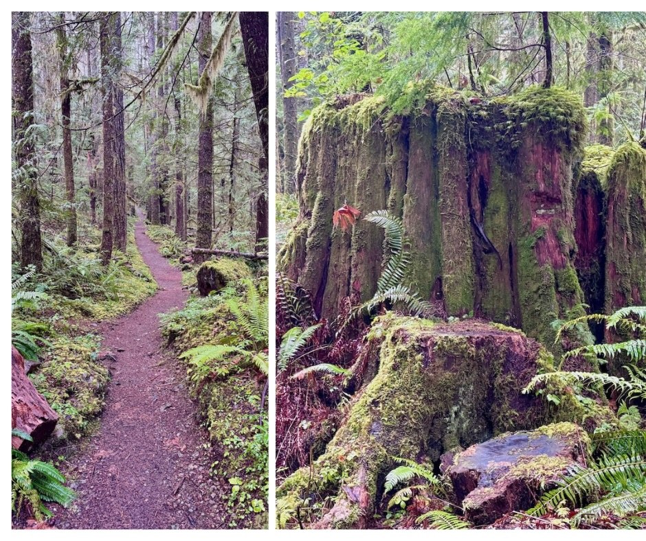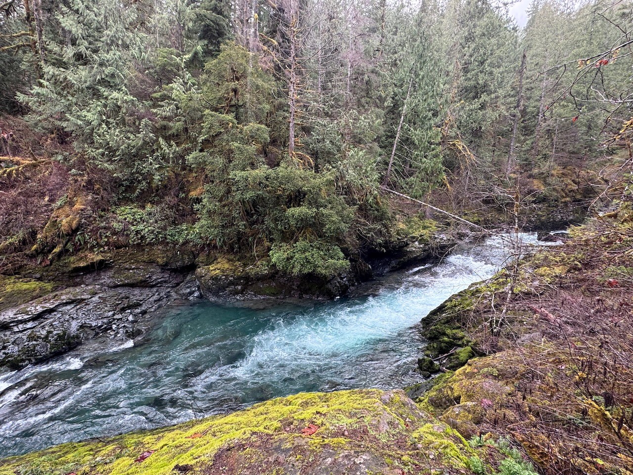 The well-maintained trail to Ranger Hole begins to the right of the cabin. It winds through deep woods of hemlock, fir, cedar and big leaf maple cushioned in thick carpets of moss and lush ferns. Impressively huge stumps give clues as to how massive the trees once were here. Now they provide mossy nurseries for another generation of tiny Hemlocks. The last section of the trail is steep and was slippery and muddy from recent rain in some spots, but not impassable. The trail ends on a rocky overlook, with wonderful viewing spots of the gorgeous turquoise pools and rushing white water of the Duckabush. (Note there is no easy access down to the river).