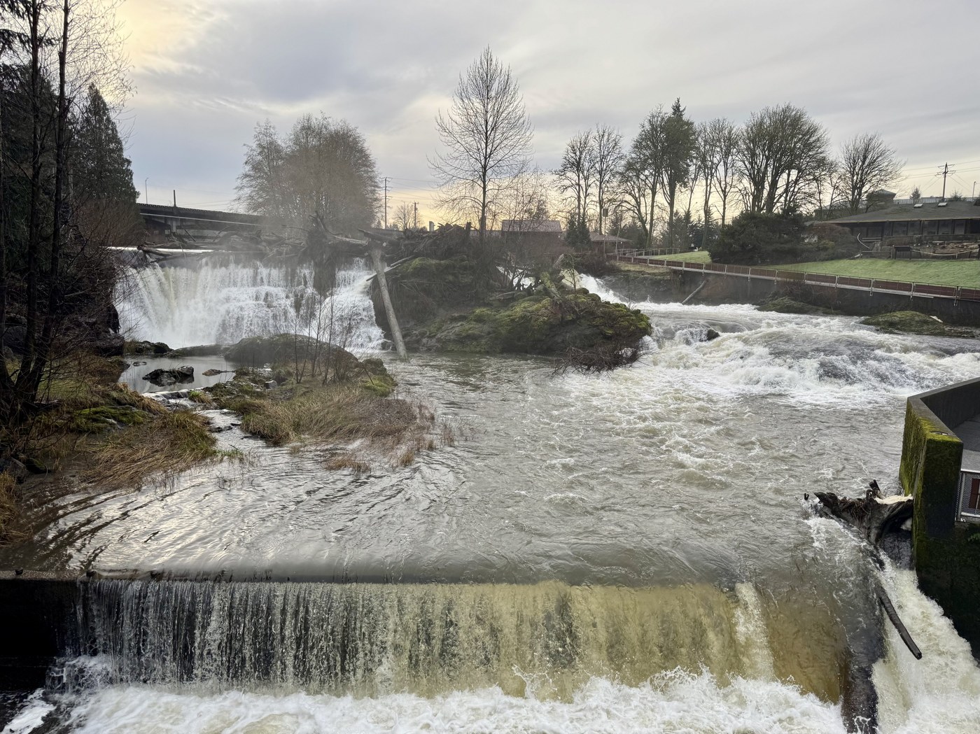 We met up at 8:00 a.m. at Marathon Park and made our way south along Deschutes Parkway to Tumwater Historic Park, then Brewery Park/Tumwater Falls Park. The waterfall flow was intense thanks to recent rains. We wondered if some enterprising restauranteur might reopen the Falls Terrace Restaurant. Looks like a great location! Returning to Marathon Park we completed one loop around Capital Lake, doing the hillclimb up to the Law Enforcement Memorial plaza for some views. The sun burned off all the morning fog except the stubborn patch settled on Budd Bay.
