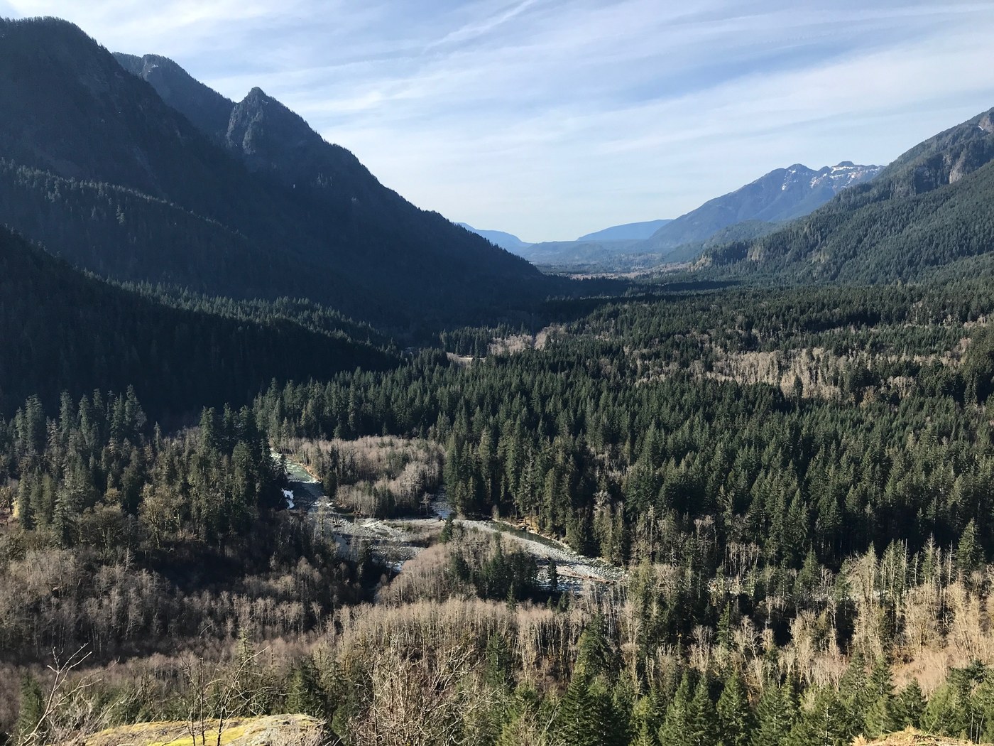 I haven't hiked much recently so picked this one for our last "spring day", as it has just enough elevation to make you feel you accomplished something! We parked at the large middle fork parking lot and walked the connector over to the start of the ledge trail. Always recommend this as the potholes on the far side of the Taylor river bridge at the ledge parking area are now car eating size. Temperatures were all over the map, 50s in North Bend on the way in, mid 30s at the parking lot - 40s when we returned. As we hiked up the ledge trail things warmed up nicely, and with the sun out the ledge is a nice place to catch a few rays. The view was great and you can see all the way back down the valley to Rattlesnake Ledge. The trail is dry and you don't need winter boots. We stepped over a number of small trees on the way to and from the ledge trail, but apart from that everything is in great shape.