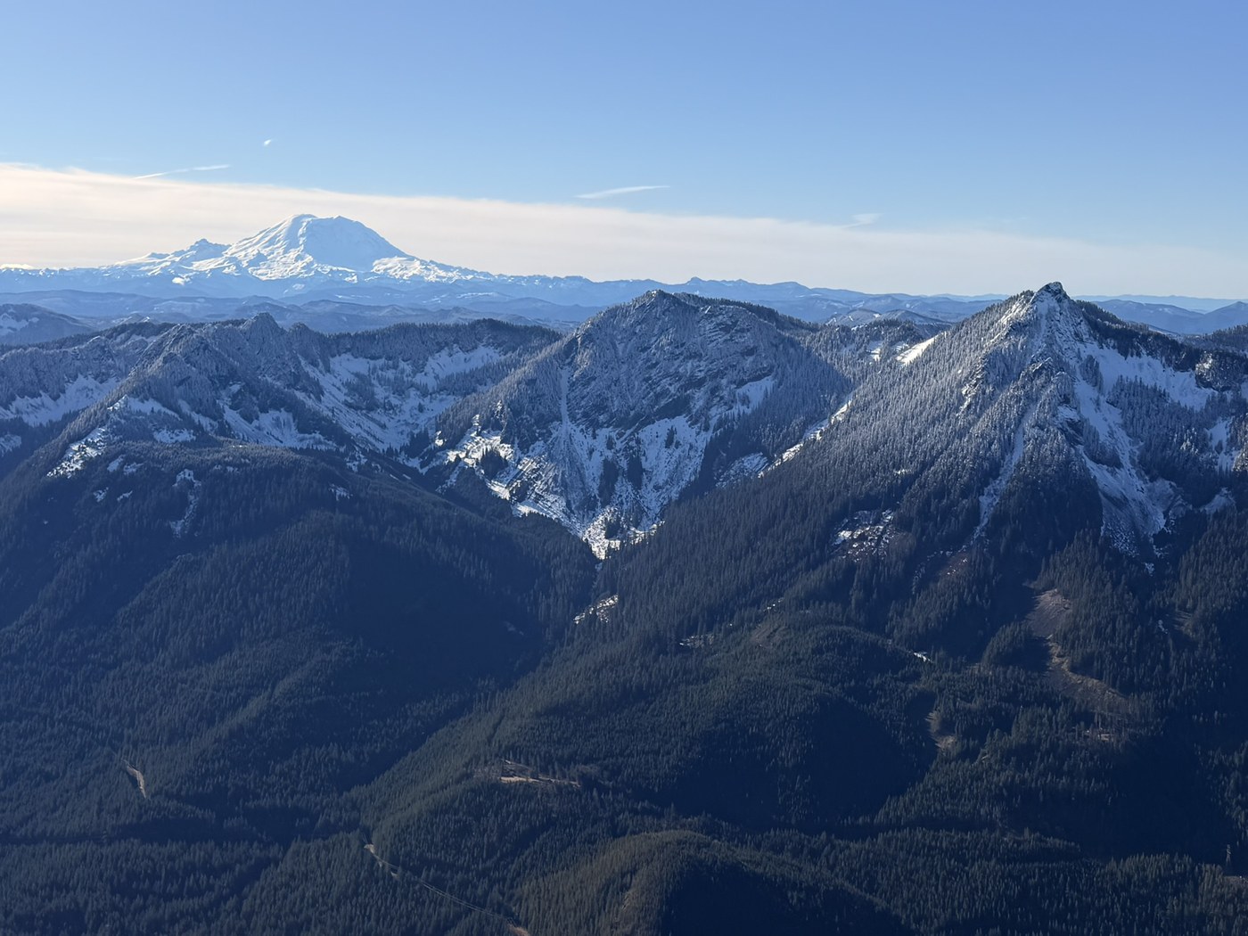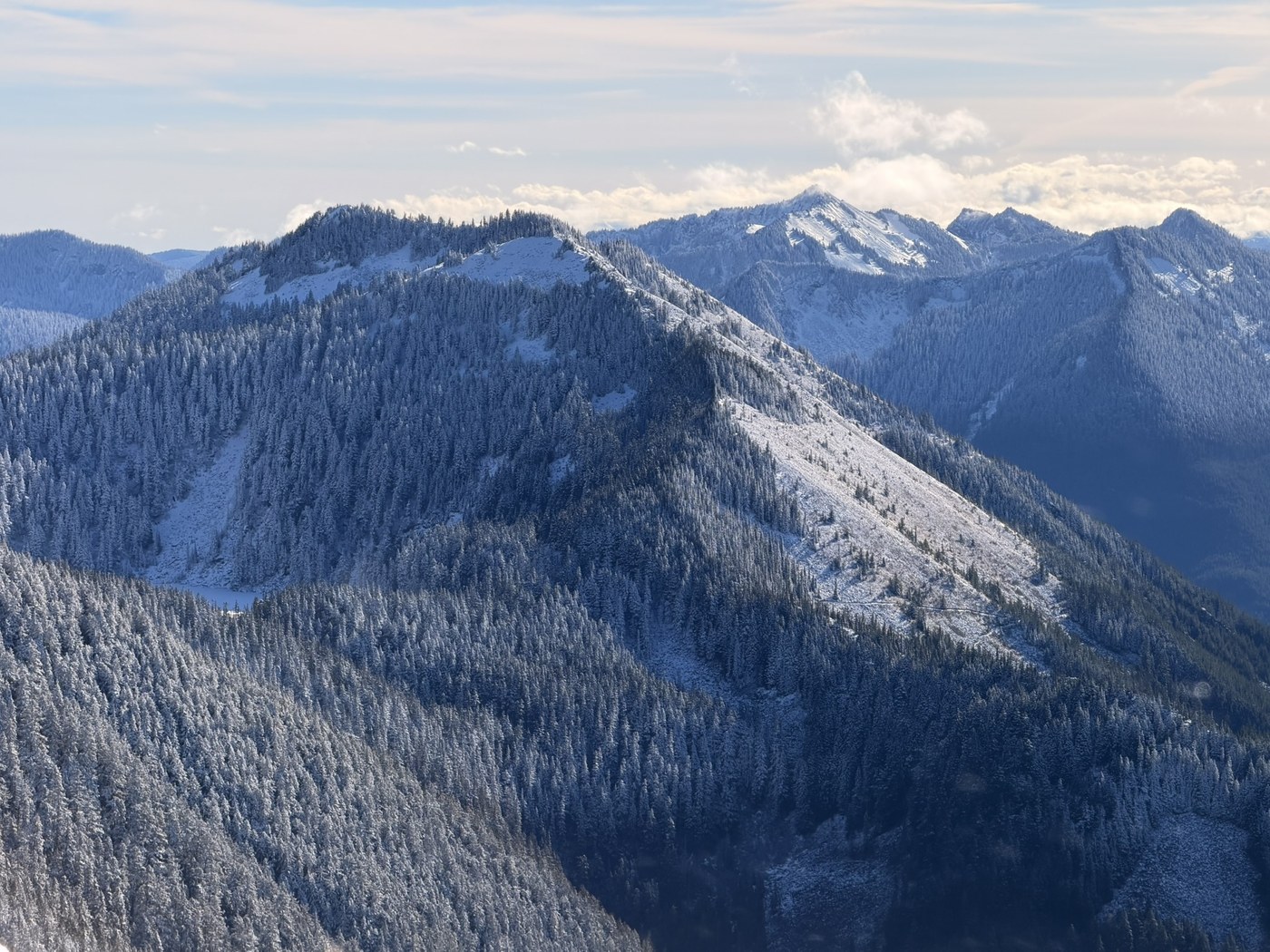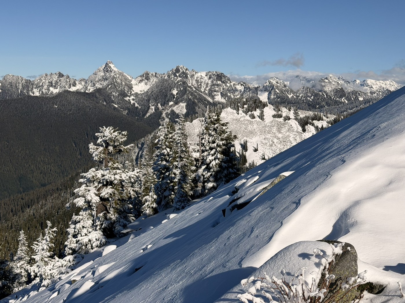 There was a couple of inch of fresh snow in the morning starting at 4000ft. It made the route a bit sketchy. I was planning to traverse from P3 to Defiance but dropped that plan when the snow hadn't melted quickly enough. I went back down with microspikes. The snow coverage was treacherous and required lots of caution.