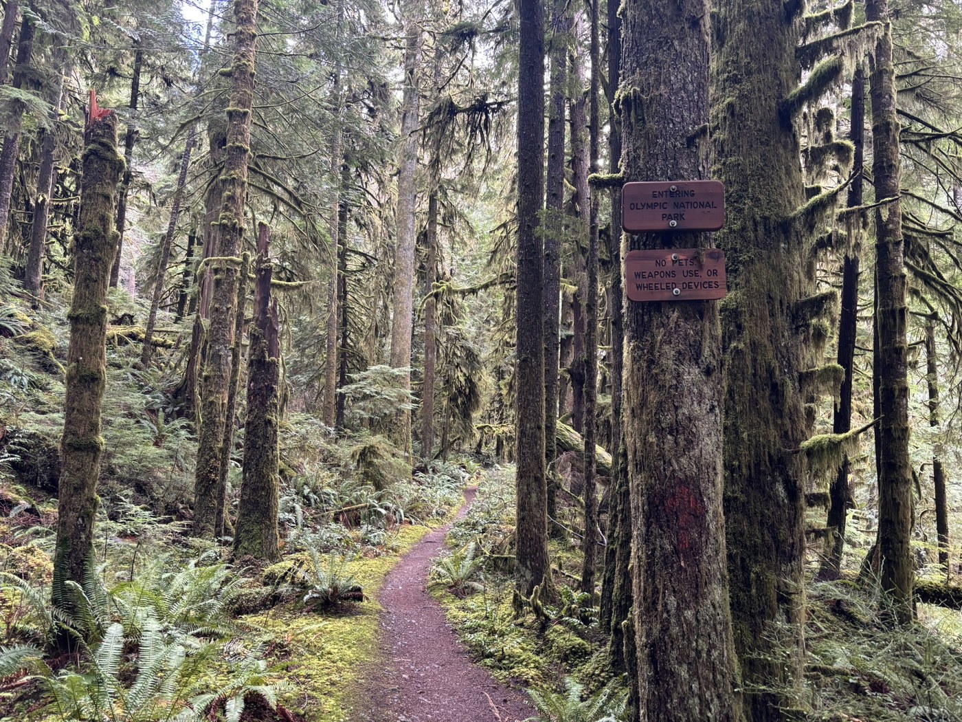This is a perfect hike for solitude in the rain forest. I hiked about 2 miles in and saw 3 other people on a Thursday afternoon. After 1.1 miles, you enter the national park and immediately there are old growth trees and tons of moss. It was beautiful hiking next to the stream and the 2 log crossings that I did were in good shape, but slippery. The trail was in great condition with no downed trees. At least the first few miles I did would be great for running.