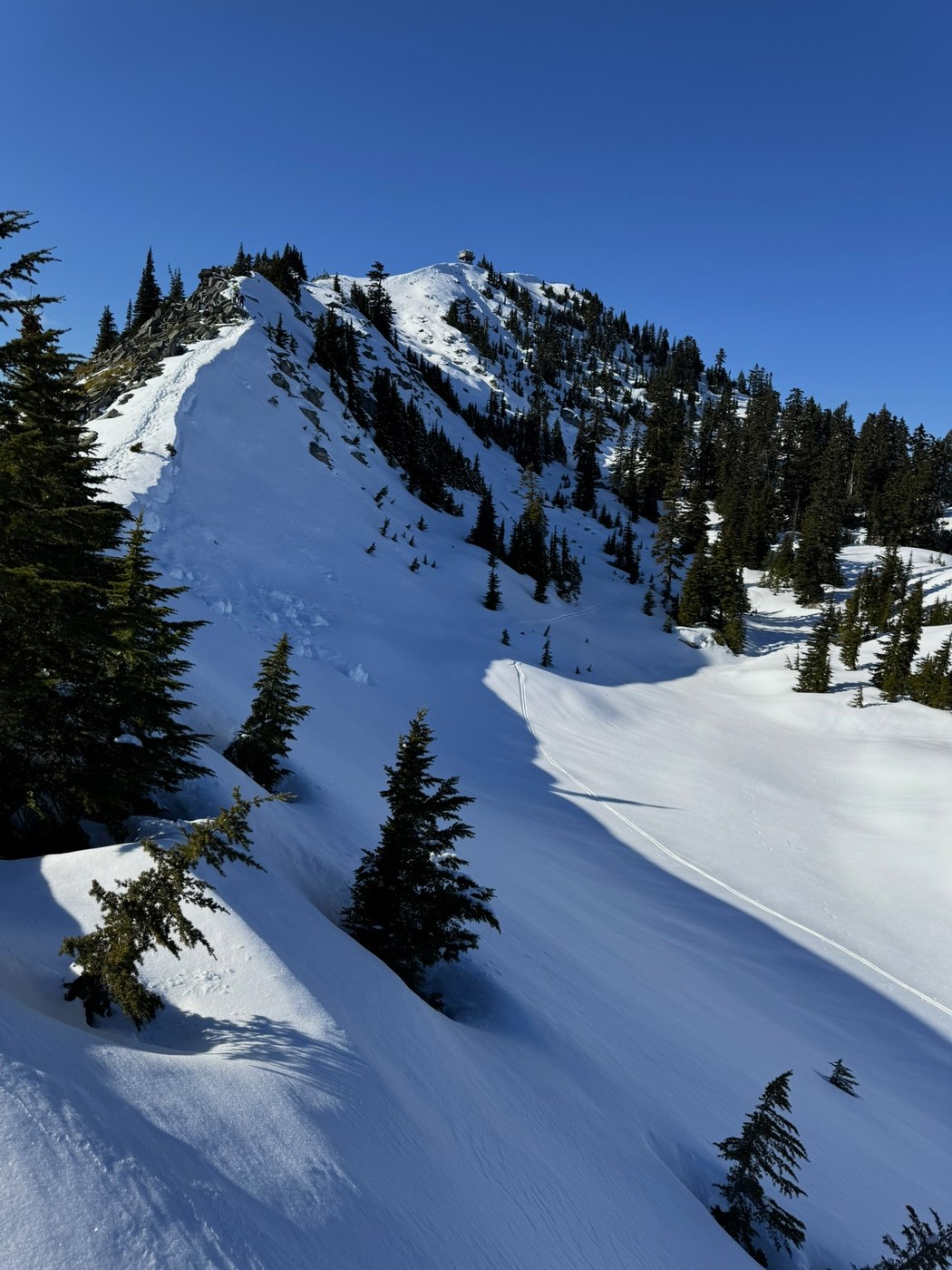 I took crampons (Kahtoola K10), snowshoes and poles. I put the crampons on at about 4200ft. The snowshoes stayed in the pack, but the poles were useful on the way down. The snow was firm and solid. Nobody seemed to be postholing today, although clearly it had been happening on previous days. Above the treeline, a series of tempting-looking false summits appeared until the lookout became obvious on the real summit. From here, the winter trail followed the ridgeline to climber’s left of the summer trail.