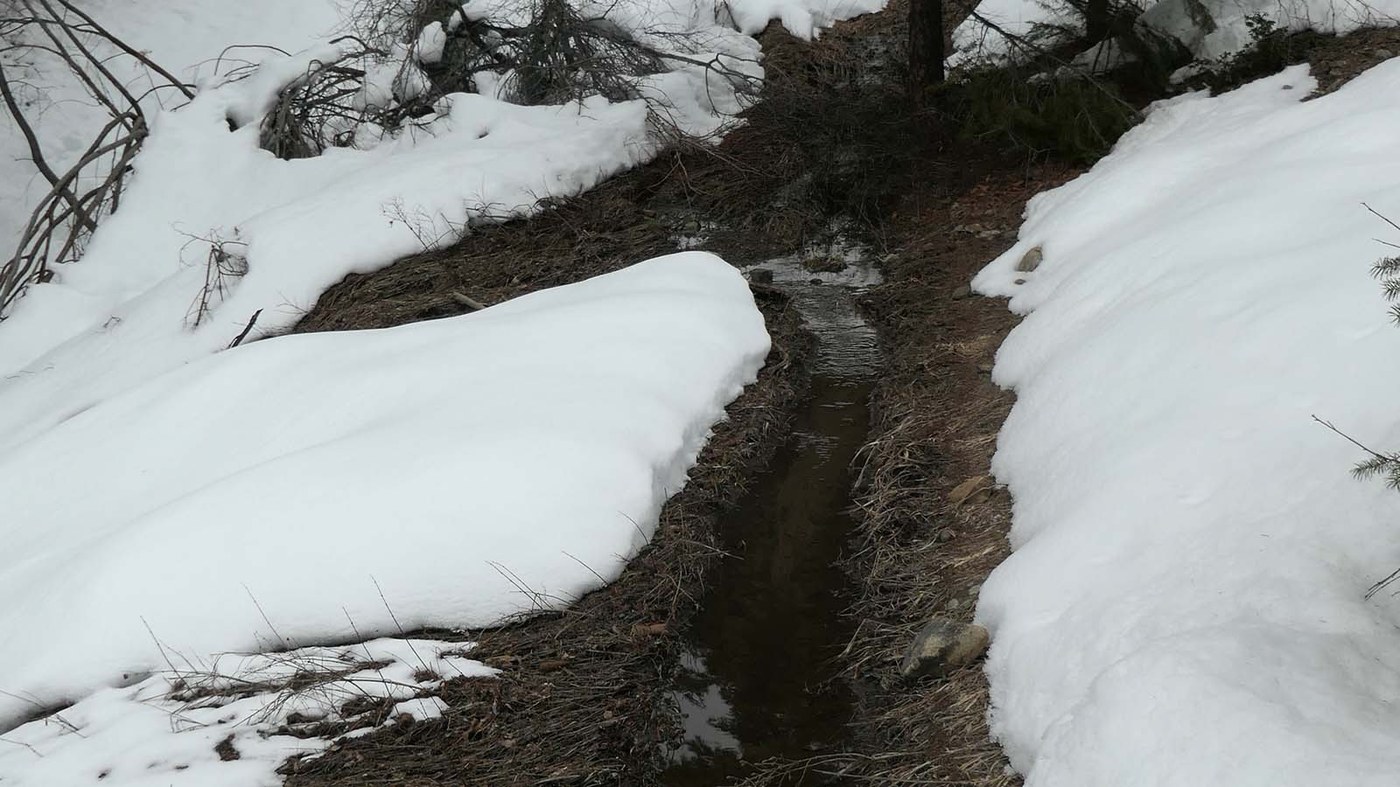 After the Driveway Butte sign, the beaten path in the snow drifted west of the trail location, ending up on the wrong side of the intermittent creek. After about 0.3 mile, the track turned east to get across the gulley and back on the trail for about 0.1 mile. At the trail's crossing of the intermittent creek, it was covered in standing water, and the area was pretty muddy. The beaten track left the trail and stayed east of the intermittent creek, at times following ski tracks. I opted for my own track, climbing steeply, kicking steps in the firm snow and following short sections of game trails on the bare ground. I regained the trail at 3600ft after a 400ft climb up the hillside.