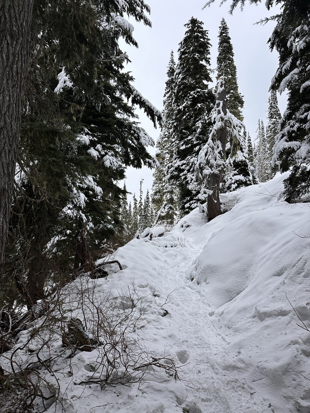 It was an absolutely beautiful, quiet, lovely time on this trail. We didn’t do the entire thing, only went about 3 miles in before turning around. That was just our preference, not because anything was wrong. We had to park near the highway due to the last portion of road that leads to the entrance being closed with ice and snow, but that didn’t extend the trek too much. No need for snow shoes at the moment and I think those would have made things more uncomfortable. We wore micro spikes which I do recommend, hiking poles would’ve been a little nice but not 100% necessary. If we had gone farther than 3 mile snow shoes may have been beneficial past 2.75 miles in.