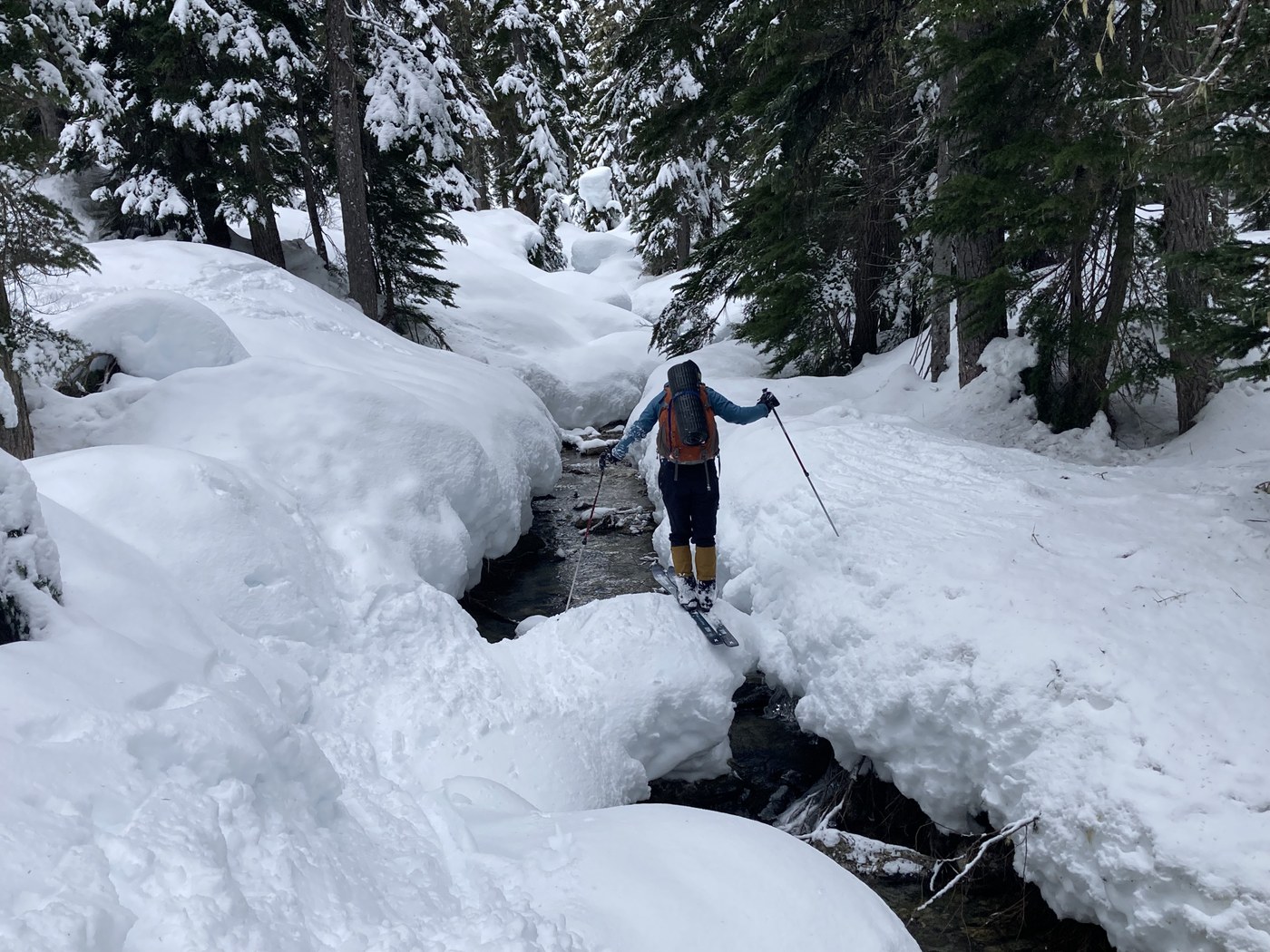 Unfortunately, we hit our turn-around time before we got to the lake today. We needed to get back to Edmonds in time for an orchestra rehearsal, so we retraced our tracks back to the car. We took the descent through the trees a little slower than usual because the thin snow coverage did not forgive mistakes.