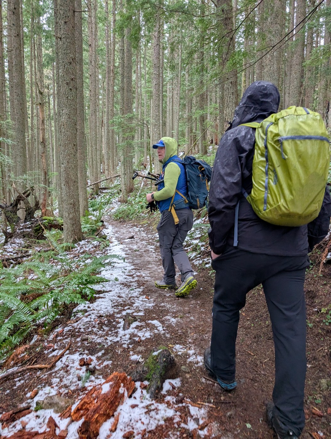 This was an easy grade most of the way. Things started to get slushy about 1.5 in then turned to snow covered though only a few inches. Spikes were helpful on the first part of the descent and the trail was much muddier the rest of the way down.