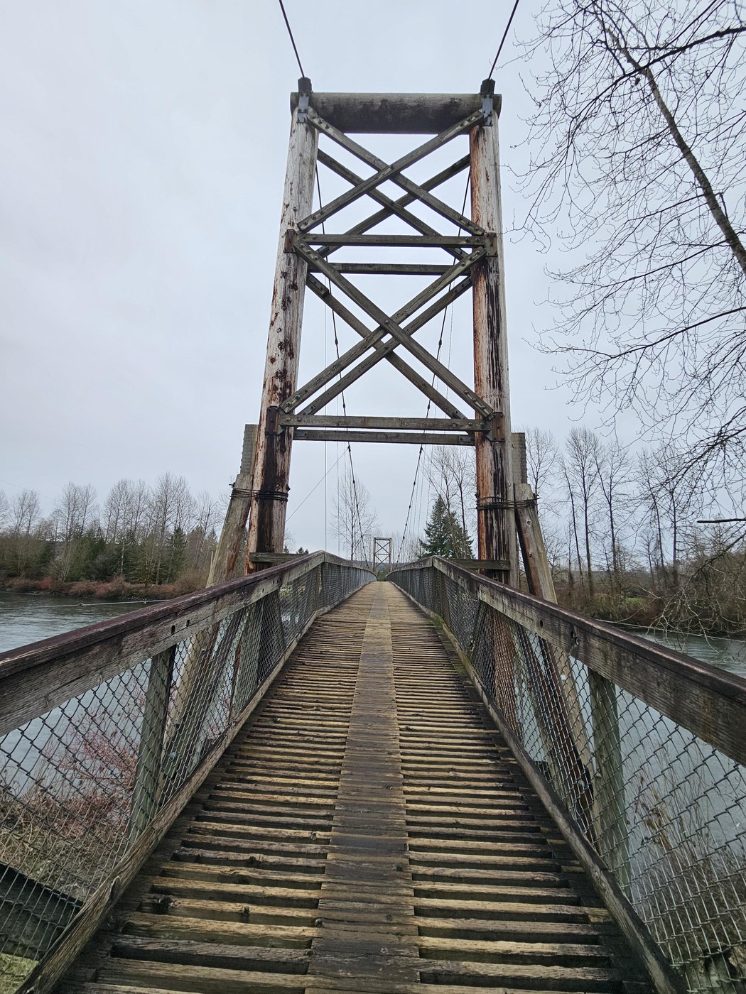 We headed down Quail Trail, which was most of our elevation change. We dropped down and passed the yurts and cabins and headed to the bridge. The bridge had a deck of interspersed slats that allowed you to see the water below and the side rails had metal mesh affording an even more open view. We could feel the bridge sway as we walked across. It was subtle, not like a rope bridge, but just enough to have to verbally confirm it was actually moving. There's a viewfinder on the bridge looking south with an image imposed of the old bridge just ahead of the current Tolt Hill Road bridge. It explains how it was the last of its kind in the US.