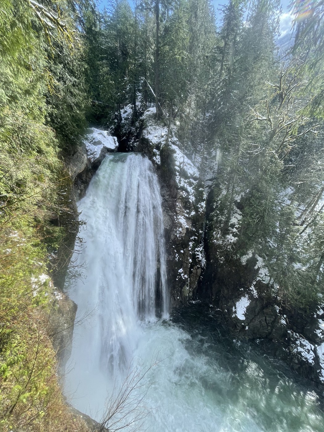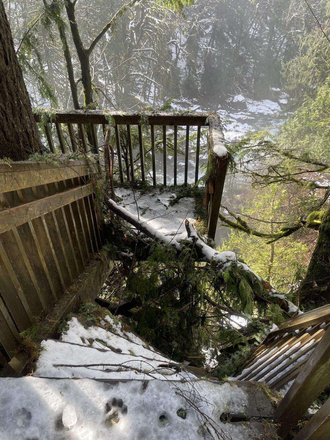 The storm really brought up water levels and the falls are amazing right now. Unfortunately part of a tree fell and took out part of the bottom viewing platform (pic 2). The river is quite beautiful with the snow and bright blue from meltwater.