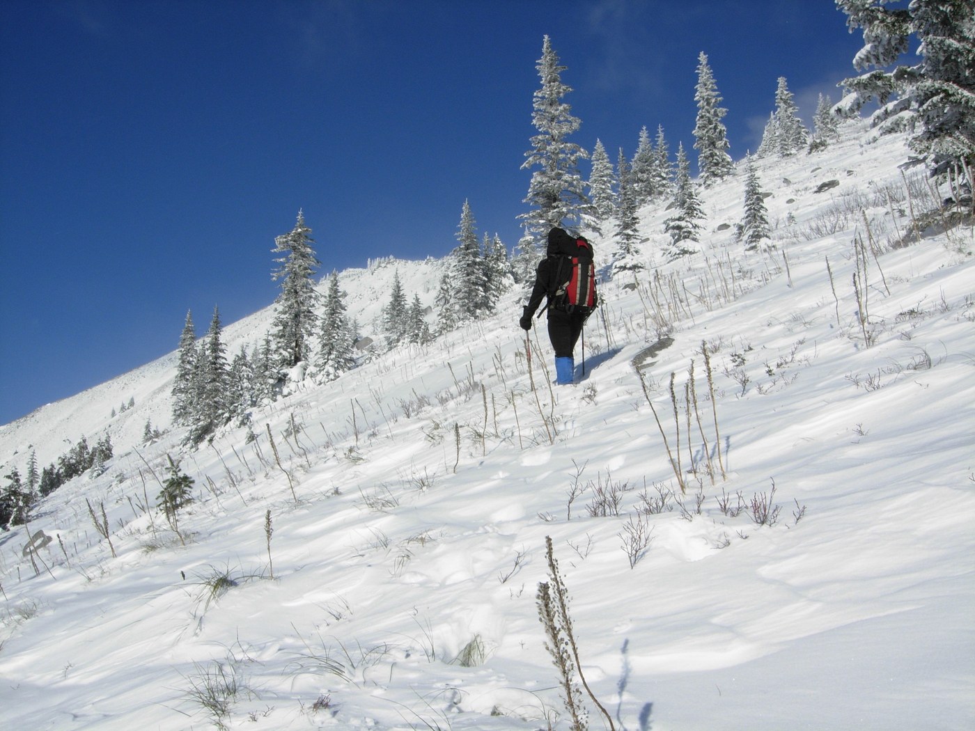 Today we thought we could get to the Granite Mountain 5629' summit. The sun was shining but the constant east wind, combined with the 5°F temperature, made wind-chill extreme on the southeast side of the mountain. That plus the deep wind-blown snow above 4500' caused us to turn back about 4700'. Three others, whom we passed on the way up, pressed on by us after putting on their snowshoes.
