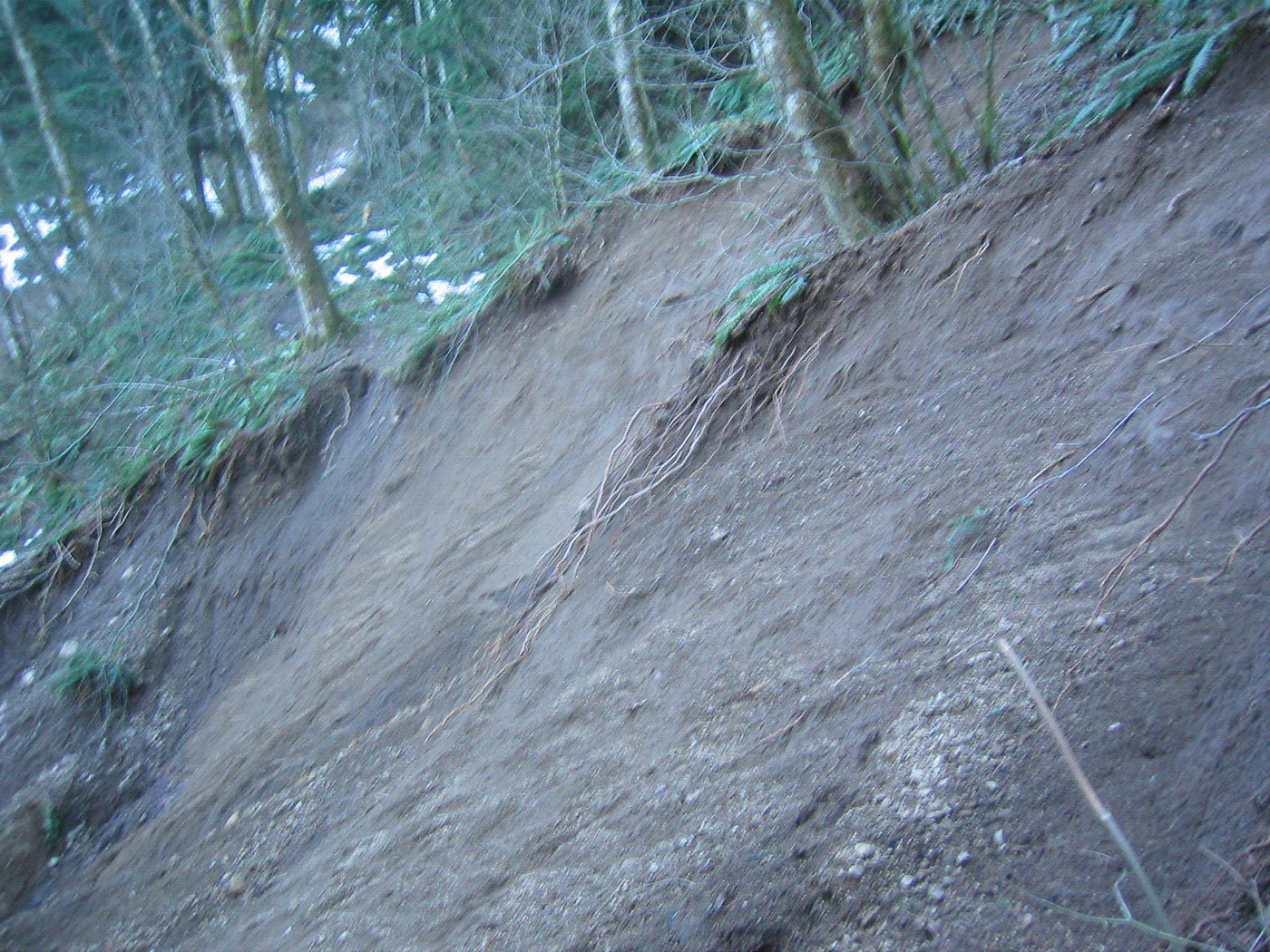 Tiger Mountain Trail - mudslide took out 60' x 100' of the hillside, trail included. 0.1 miles east of TMT/W Tiger RR Grade junction, elev ~1940' near Upper TMT crossing of High Point Ck.