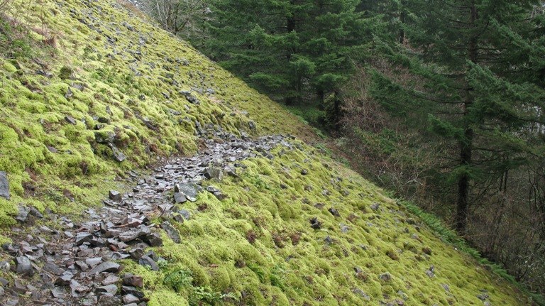 We noted flagging hung below Hwy 14 indicating where a potential re-route would bring the trail away from the cliff edges and seeping springs which are sensitive areas for riparian vegetation and flowers. The re-routes would also bypass the current trail location where it switches-back across moss covered talus slopes that are rare habitat for the Larch Mt. Salamander.