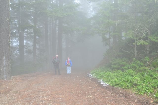 We parked at the closed gate on the Mt Walker Road and hiked .25 miles to the TH. In 2 miles and 2000 ft elevation gain we reached the North Summit where we had no views because of the fog. However, we had good exercise to prepare us for our week-end of hiking. How beautiful this trail must be when the rhodies are blooming! The trail was clear.