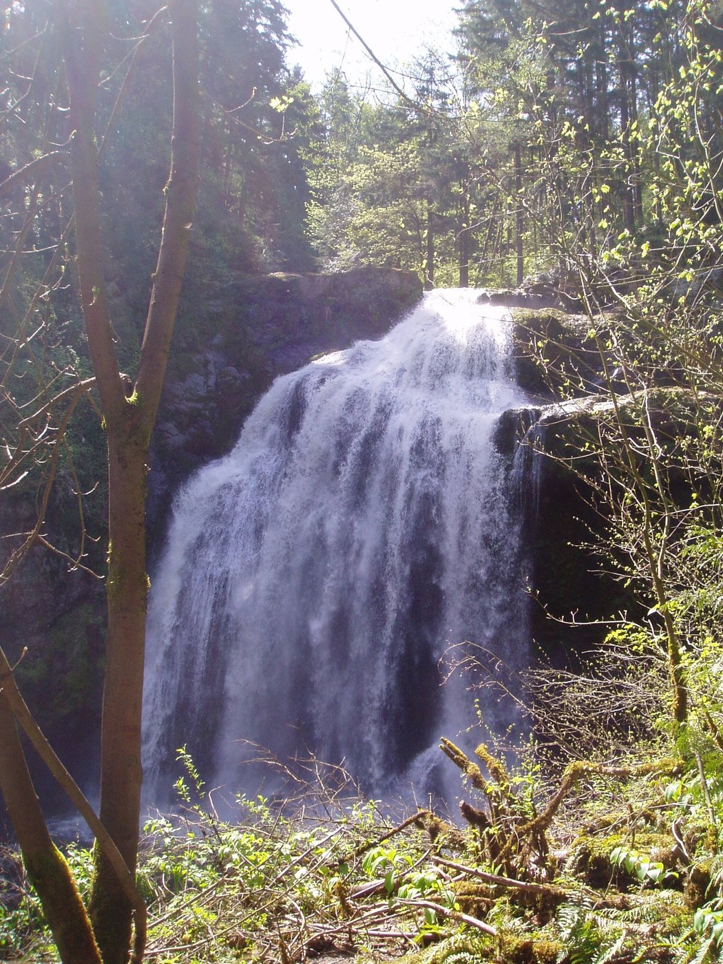 Hiking partner Goober Canari e-mailed me an article about Hugo Falls in the Pack Forest area owned by University of Washington. After my initial reaction of, huh?, I read on. Also went on Pack Forest website where there is a map and descriptions of the trails/roads in the area. Robert Michelson's trip report on this site from last year gives good info on Pack Forest. It is near Eatonville off of Mt Hwy (7). I got back to Goober and we decided this sounded like a good Spring hike. We hit the upper trailhead by 8 AM. There were maps at the trailhead. We started out on the south 1000 road until it bisected the Hugo Peak trail. There is some elevation gain and the trail is somewhat steep at first. The trail ends at an intersection with roads 1080 and 1081. We took 1081 a short distance to the summit. There are limited views of the valley below and partial Olympic range. There is also a register which we signed. Hugo Peak brought back fond memories from HS of Tommy "Hugo" Tomal. Before you say, huh?, note that would be exactly Hugo's response. We continued back to 1080 road and took the Reservoir Trail. There were some large (standing and downed) trees on the trail. The large blowdown was easy to traverse over. The 1060, 1000, and 1070 roads respectively take you to the (Little Mashel) Falls Trail. There was one clearing along the road with a spectacular view of Mt Rainier. The Falls Trail is not very long, but a bit muddy. We went to the Middle Falls which had a lot of water crashing down. Nice cool spot for a break. We retraced our route back but took a couple of side trails (Regeneration and Wildlife). We briefly spotted a dear on the Wildlife Trail. Also coralroot. Watch out for nettles on part of this trail! We either made one wrong turn or one of the roads was mis-signed. Either way, it was a short backtrack and we were on 1000 road north, which took us back to our car. Overall, the roads and trails are well signed and marked. We did not see anyone on the trails/roads all day until just before returning (2 ladies out for a stroll) even though the weather was perfect. I recommend this hike for families or adults. Good Spring exercise.