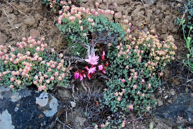 We turned off State Route 821 (Yakima Canyon Road) onto Selah Springs Dr.and drove 3.2 miles to the parking area as described in Best Desert Hikes Washington by Dan Nelson and Alan Bauer. The last half of this road is very rocky, but driveable for most vehicles if driven slowly and carefully! After passing through the gate at 1.6 miles from 821 we were on BLM land. There were fields of "spent" large-headed clover which must have been beautiful in their prime! There were several Horned Larks perching on the sagebrush as we drove the road to the TH. The Hooker's balsamroot was also "spent", but we decided to walk north along the ridge to the first white pole to hopefully find some fresh flowers! At about 1/8 of a mile from the TH we were glad we had decided to walk as we began to see fields of thyme-leaved buckwheat and bitterroot.It was difficult to walk and not step on the bitterroot! How beautiful were these fields and the view down to the Yakima River! We hiked about 2 miles one way.The temperature was in the low 90's, but there was a breeze which made the heat tolerable! The bitterroot were just starting to bloom so should be good for 1-2 more weeks! We also saw, Oregon sunshine, pentstemon,thread-leaved phacelia,and Hooker's onion. We saw very few hedgehog cactus and their blooms were "spent".