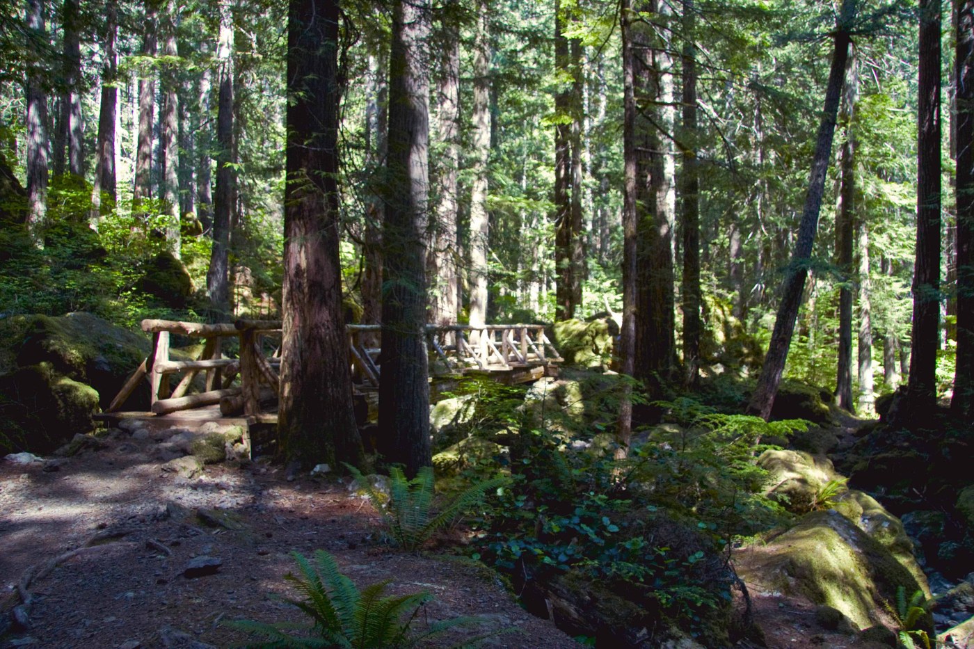 The weather was great, no rain, lots of sun and very warm. The Lena Lake trail begins with a series of long switchback (I believe 9 in all) starting in second growth forest but soon blends into old growth forest with large trees, and fallen underbrush heavily overgrown with ferns and moss. There are two sturdy bridges the first crosses a dry riverbed and the second crosses a gentle cascading creek.