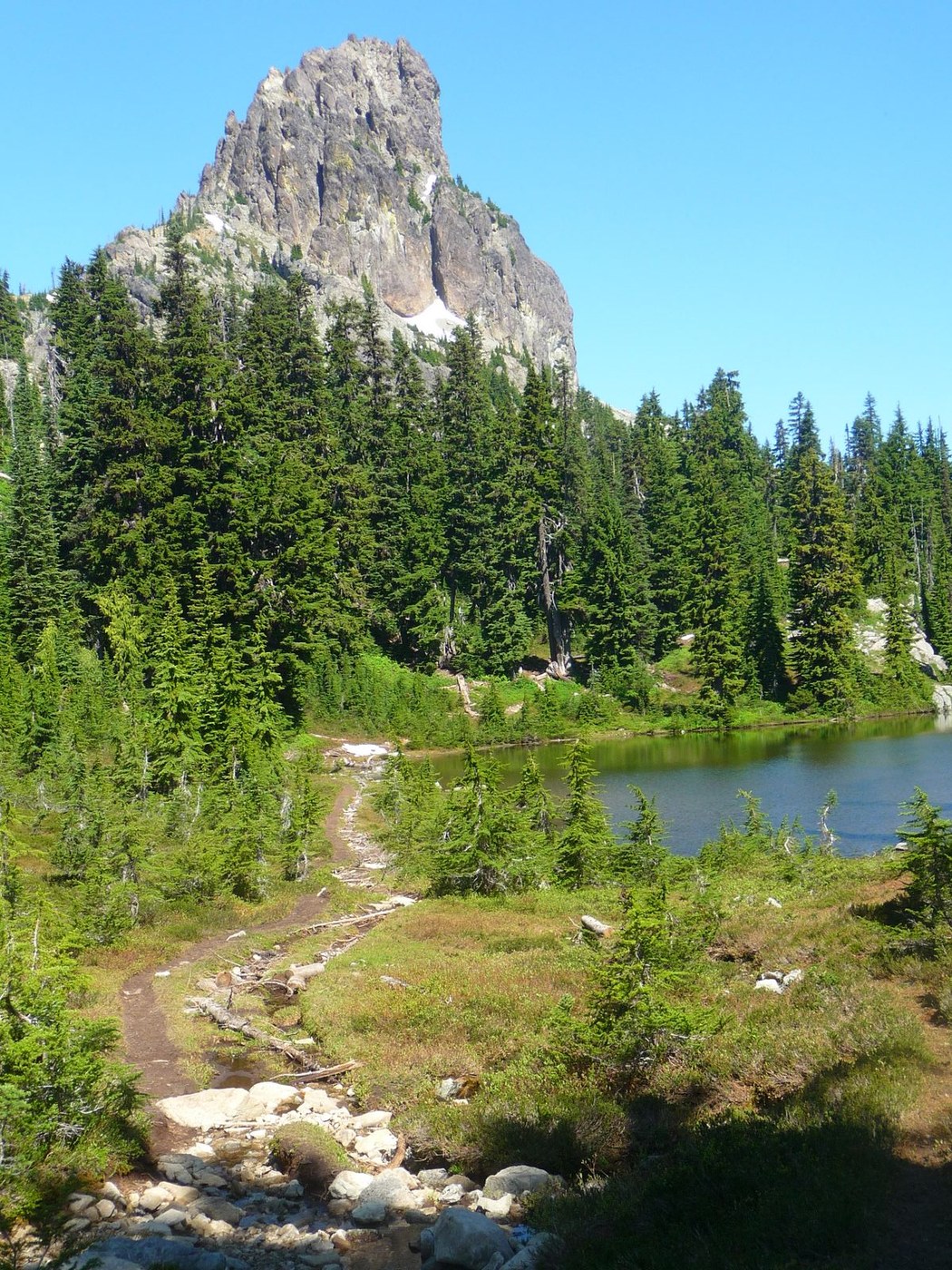 Friday, July 17, 2009 was another great day for a hike: warm but not hot. The drive on the access road from I90 will take nearly an hour but the drive is pleasant as you past marshy lakes and large meadows filled with flowers. There is a water crossing of Scatter Creek but most vehicles should be able to cross. I was alone on the trail until mid afternoon on the way back to the trailhead. The trail was almost completely snow free with only one minor blowdown. Trees and vegetation are not too different from the westside of the Cascades. The flowers, birds and hummingbirds are out. Because of me bright red T-shirt, I buzzed several times by hummingbirds. Squaw Lake is a nice rest spot and you may spot a trout or two in its clear waters. Small meadows and tarns dot the flat ridge top. Once you start from the trailhead, you do not see Cathedral Rock again until the last half mile or so and then you are greeted by the mass of Mt Daniel and its glaciers. You can hear the muted roar of the cascades off it steep slopes. And behind behind you, you see the pyramid shape of Stuart’s peak behind the Wenatchee Mountains. The more venturesome can try the the narrow trail below the steep slopes of Cathedral Rock to Peggy’s Pond. I turned back halfway into the trail as I could not see a clear continuation and with commitment to a guessed trail that may be difficult to extricate if I had guessed incorrectly. There were plently of mosquitoes and other bugs; bring bug juice. (more pics at http://picasaweb.google.com/steve.d.podleski/2009CathedralRock#