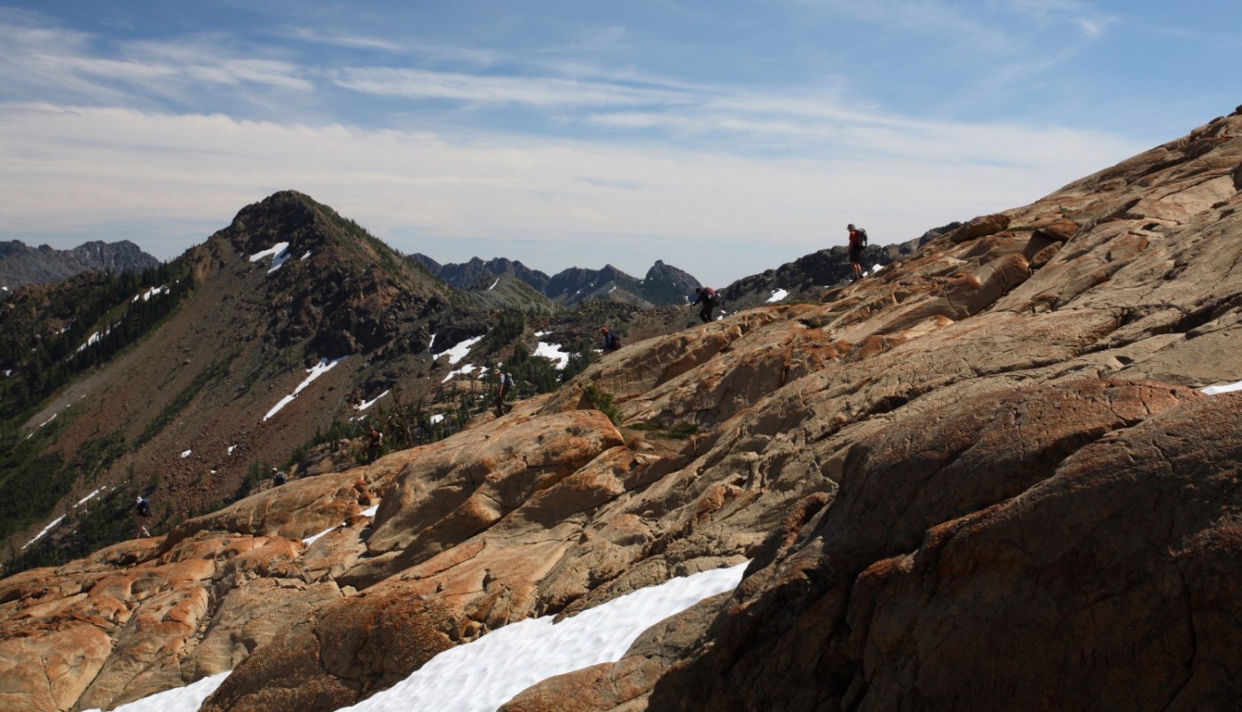 A relatively late start had me hiking from the trailhead by 11:00am. The parking lot was overflowing, so I prepared to be pleasant. “Hello”s, “Hi there”s and other pleasantaries kept me occupied and entertained, when I wasn’t gawking at the jagged picket line of the Esmeralda Peaks, across the valley. Lots of flowers, red rocks and open green forest made for a tastefully colorful display. Enjoying every minute of it I reached Ingalls Pass, took a photo of 2 other gawkers and then feasted my eyes on Mount Stuart. One view I’ll never tire of!