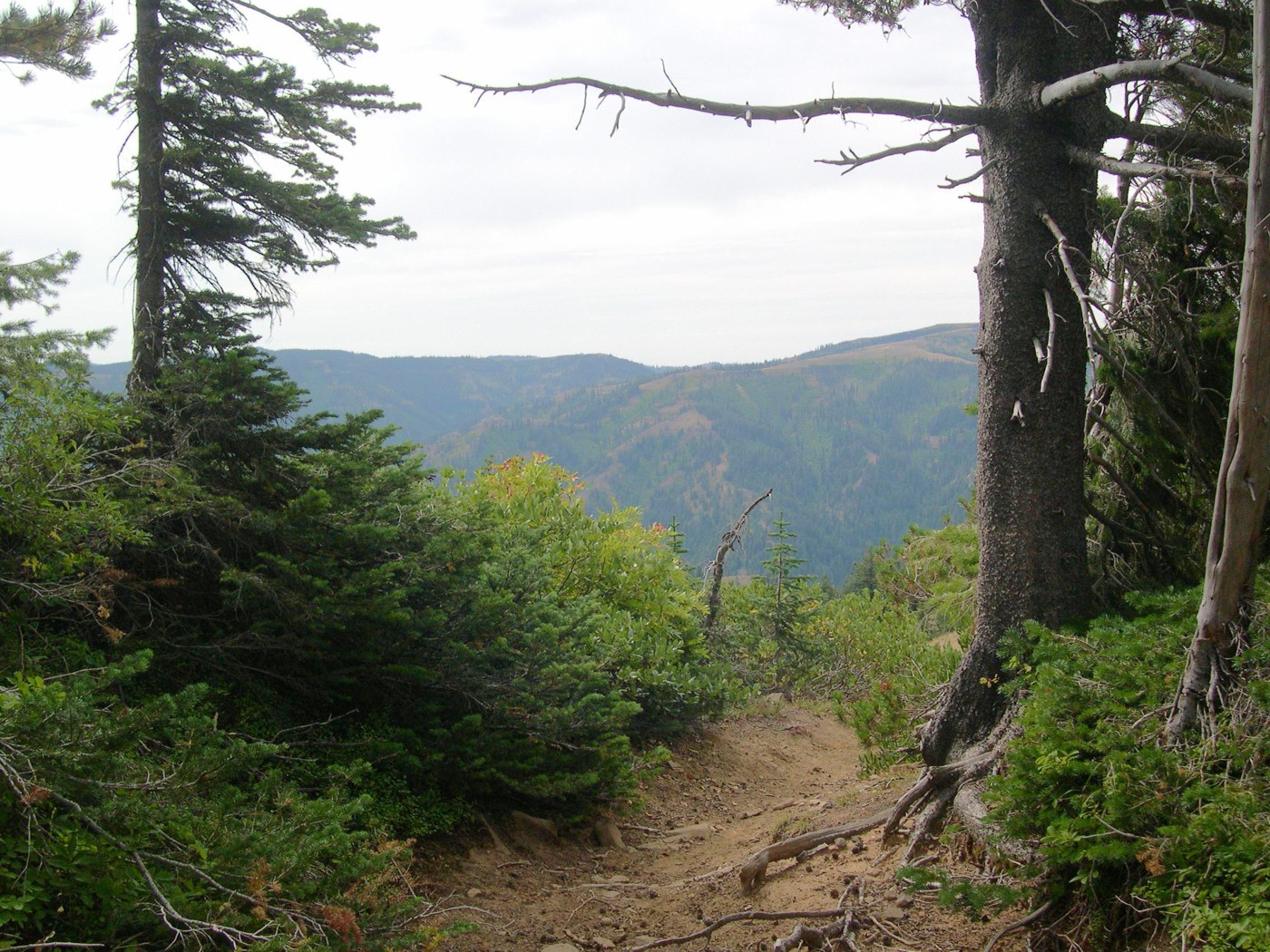 Few trip reports ever come from the Blue Mtns, especially in late summer. Western Washington and the Cascades were deep in rain on Sept 6, so we went to the Blue Mtns behind Bluewood Ski area, and found a long trail on the Umatilla National Forest map (14 miles long, winding up intersecting the Wenaha River Trail in Oregon). It was the beginning of bow season for deer, but since it was late morning by the time we got there, all the hunters were in camp or on the road. Trailhead easy to find, just down 1/4 mile on a dirt path from the skyline road. The Sawtooth Ridge trail is relatively flat-- you start at the top and just follow the ridge line into the Wenaha-Tucannon Wilderness. After about 5 miles the trail starts its decline to the river bottom. Watch out for the side trail to Lady Springs on Burnt Flat, about 2 miles from the trailhead-- the side trail is all we saw, and wound up hiking down Beaver Ridge instead of Sawtooth Ridge. Not sure it made any difference in the hiking, but that trail isn't as long. No water on the trail, but still had wildflowers, and absolutely no other hikers or hunters. Some blowdown, especially past the 2 mile point. Lots of wildlife sign, including bear. Would be especially beautiful in early summer right after the snow is gone and the wildflowers are at a peak. Also not bad for backcountry X-country skiing-- ski up the forest service road that passes Bluewood. Better snow (colder and deeper) than the Cascades get!