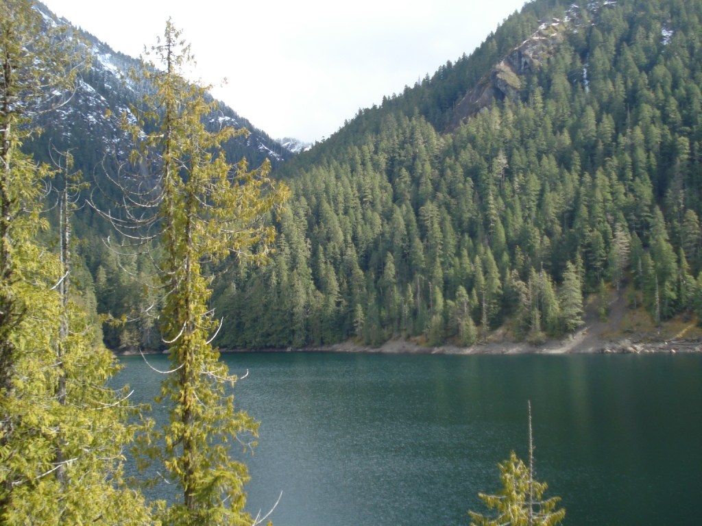 We reached the empty trailhead at 10 a.m., seeing only a lone coyote on the drive in. It was a sunny, quiet morning and the trail was in excellent shape. A winter wren gave us a good look (and a good buzzy warning, I think, to keep moving along). Pine siskins and juncos chattered. Shrubs in the understory are poised to begin leafing out. Enjoyed a few trillium, fawn lilies, and yellow violets near the start of the trail. We encountered only one blowdown just before reaching the lake, but it was easy to cross thanks to a notch that someone had carved out.