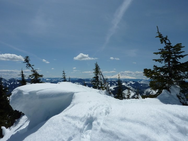 Upon reaching the ridge and turning towards the peak, we found full snow coverage. This was really territory for ice axe, snowshoes, etc, but we persevered. We made the "false summit", and due to continuing heavy snow conditions to the official summit along a narrow snowy ridge, we decided to go no further. Ice axe and traction footing strongly recommended beyond this point.