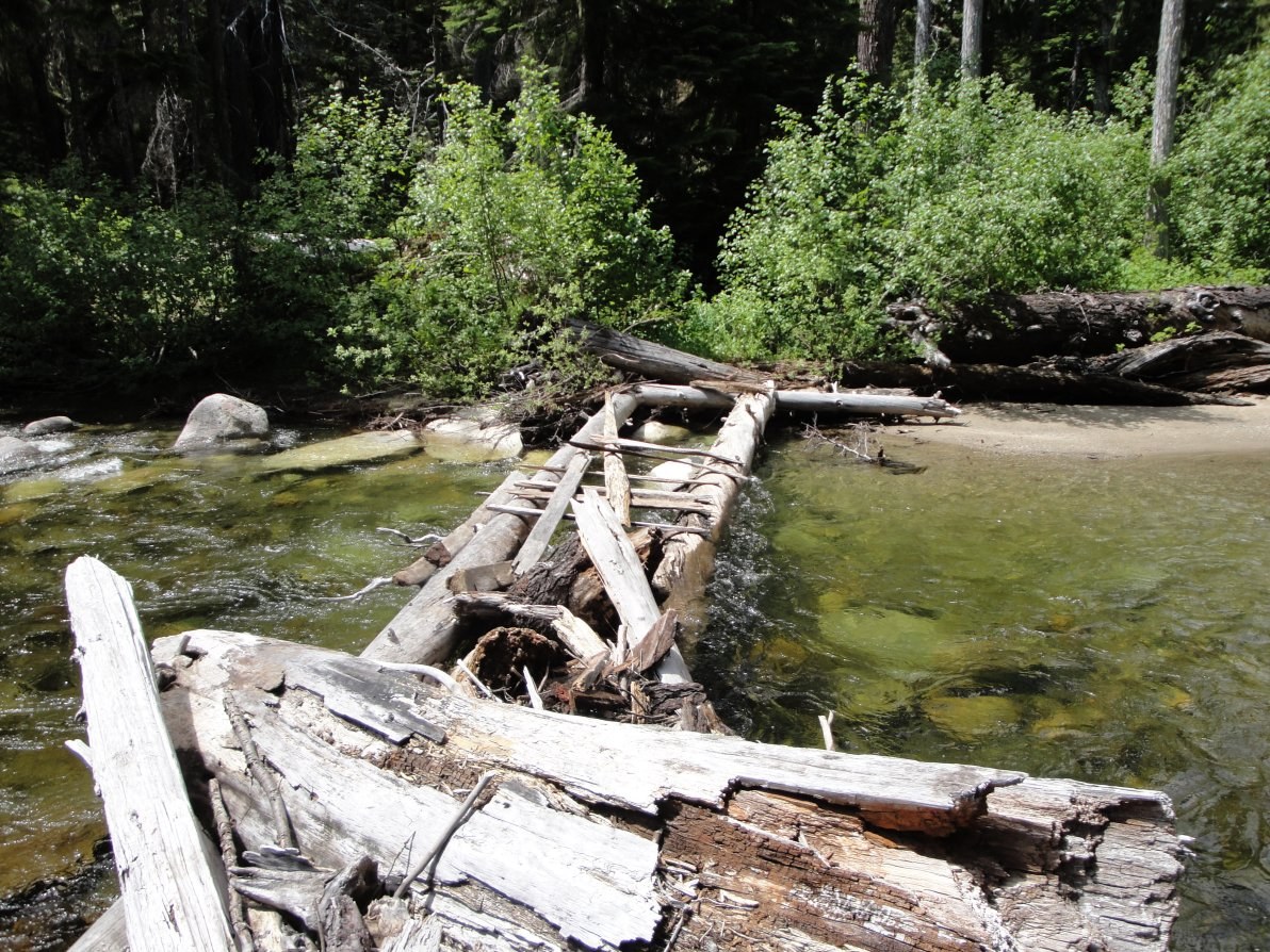 Anyway, had a nice relaxing stroll up Icicle Cr trail to the Leland Cr junction although portions of this trail were extremely overgrown and the bugs were bad in spots. Then things got interesting. Icicle Creek was a raging torrent without a bridge or reasonable looking ford. Eventually I found a couple logs upstream which I improved by adding logs to create a precarious bridge. The next ford at Leland Creek was also far too deep and fast for me, but fortunately I found a decent logjam downstream. Following this the trail became much fainter, brushy and overgrown up to the junction with Square lake trail which is at another ford of Leland Cr. I saw no sane way of crossing at this location. But fortunately my plan was Lk Leland so I continued up a trail signed 'No stock beyond'. From here to Lake Leland the trail was extremely faint, overgrown, brushy and completely covered in many places with blowdown. I lost and re-gained the tread in many places as it has virtually disappeared in some areas. Then route-finding became even harder as what little remained of the trail was covered with up to 4-feet of snow. The last mile was extremely difficult due to numerous creek crossings and snow bridge collapse danger.
