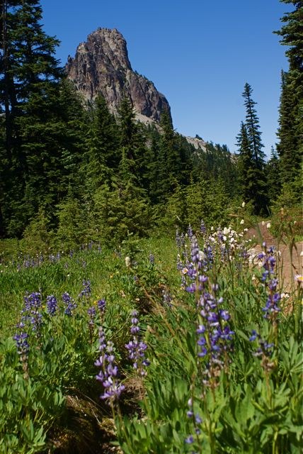 The recent edition of the North Cascades hike book says the trail to Squaw Lake is appropriate for kids but they would have to be hardy hikers, not beginners or wee ones. It's not a tough hike, but has some steep sections and is rocky on the way down. Once past the lake the trail has been much improved for drainage and tread since I last hiked it in the early '00s. There is still a little mud, but nothing to worry about and no snow anywhere. The main flowers were lupine, beautiful as they juxtaposed the barren face of Cathedral Rock.