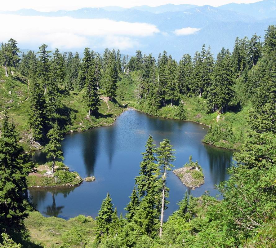 - There were a couple of hornet (bee? wasp?) nests next to the trail, both on your right as you ascend. The first was about 2 miles from the trailhead, just past the boulder field and just before the start of the switchbacks up to the lakes, on a fir sapling leaning over the trail. It was safe to walk right by it. The second was almost at the fork, lower to the ground, and harder to avoid, so we detoured a few feet through the brush.