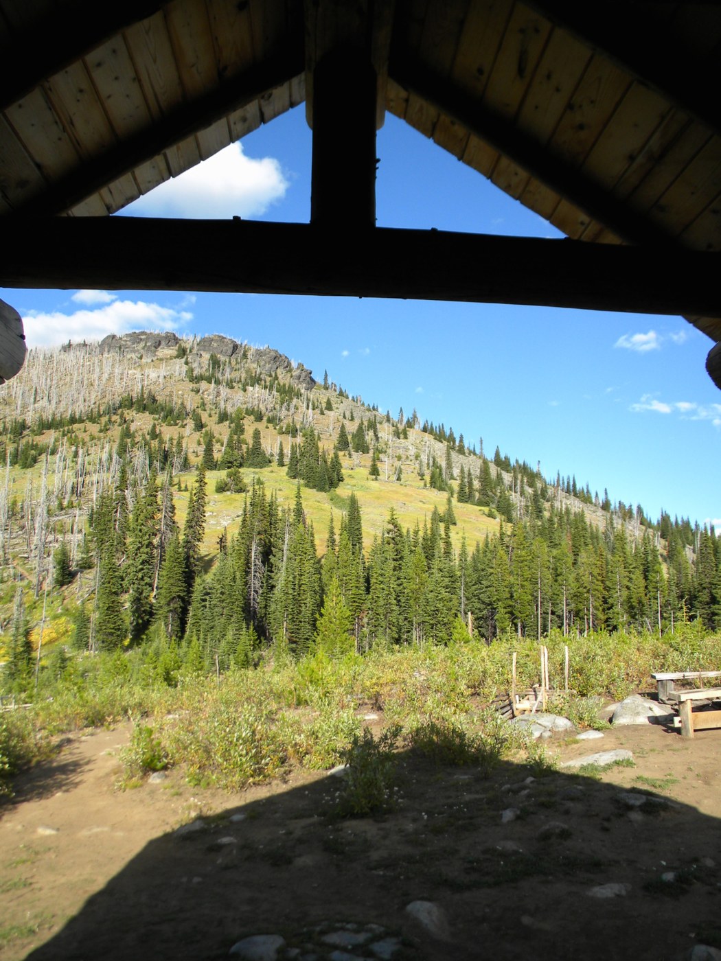 Snow Peak Trail #10 goes 2.7 miles east, 600ft elevation gain, and then connects to the Kettle Crest Trail #13 (which is also part of the Pacific Northwest National Scenic Trail). To get to the cabin, turn right and go south for 0.5 miles. (Trail area map: www.fs.fed.us/r6/colville/2007-recreation/trails/trail-maps/sher_edds.jpg) The trail winds up and up through the site of the 1988 fire started by lightning on White Mountain on the south end of the Kettle Range.