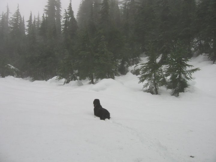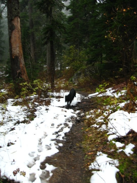 After the junction with the PCT you walk along Mirror Lake. Only glimpses of the lake are visible as we're hiking in the clouds. At the outlet of the lake Zoey decides that a little swim is called for.