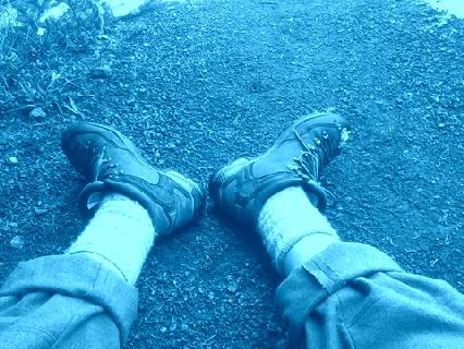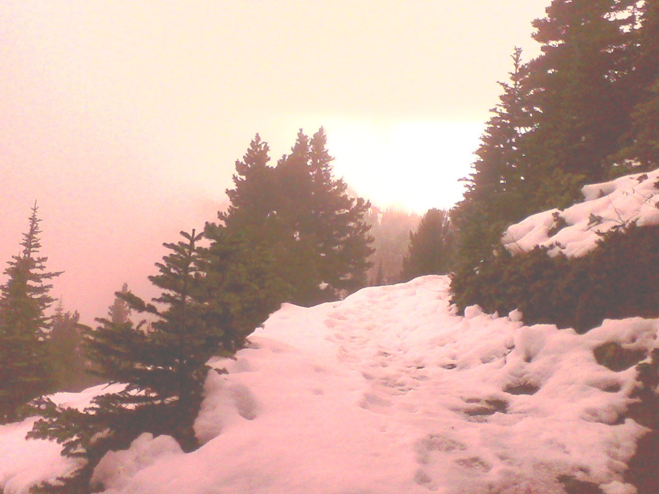 The temperature was pretty mild at the start, due to physical work and altitude. At 4944' there was a very slight dusting of snow begining. The temperature really began to drop and I found more solid snow on the ground about 5300' or so. It wasn't too deep and the traffic which passed before me had compacted it to ice. I walked beside the trail and made good use of my trekking poles. *Some of those YakTrax deals for your boots would've been ideal here.