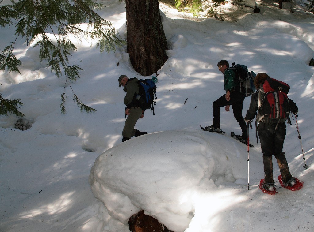 The road up to Salmon La Sac still had a sheen of thin ice the last few miles from the camp ground around 9:30 am, but just taking it slow was just what was needed to keep from sliding. There was a lot of snowmobile activity at the end of the road but they broke off to the right and the snowshoe trail was just our hiking group.