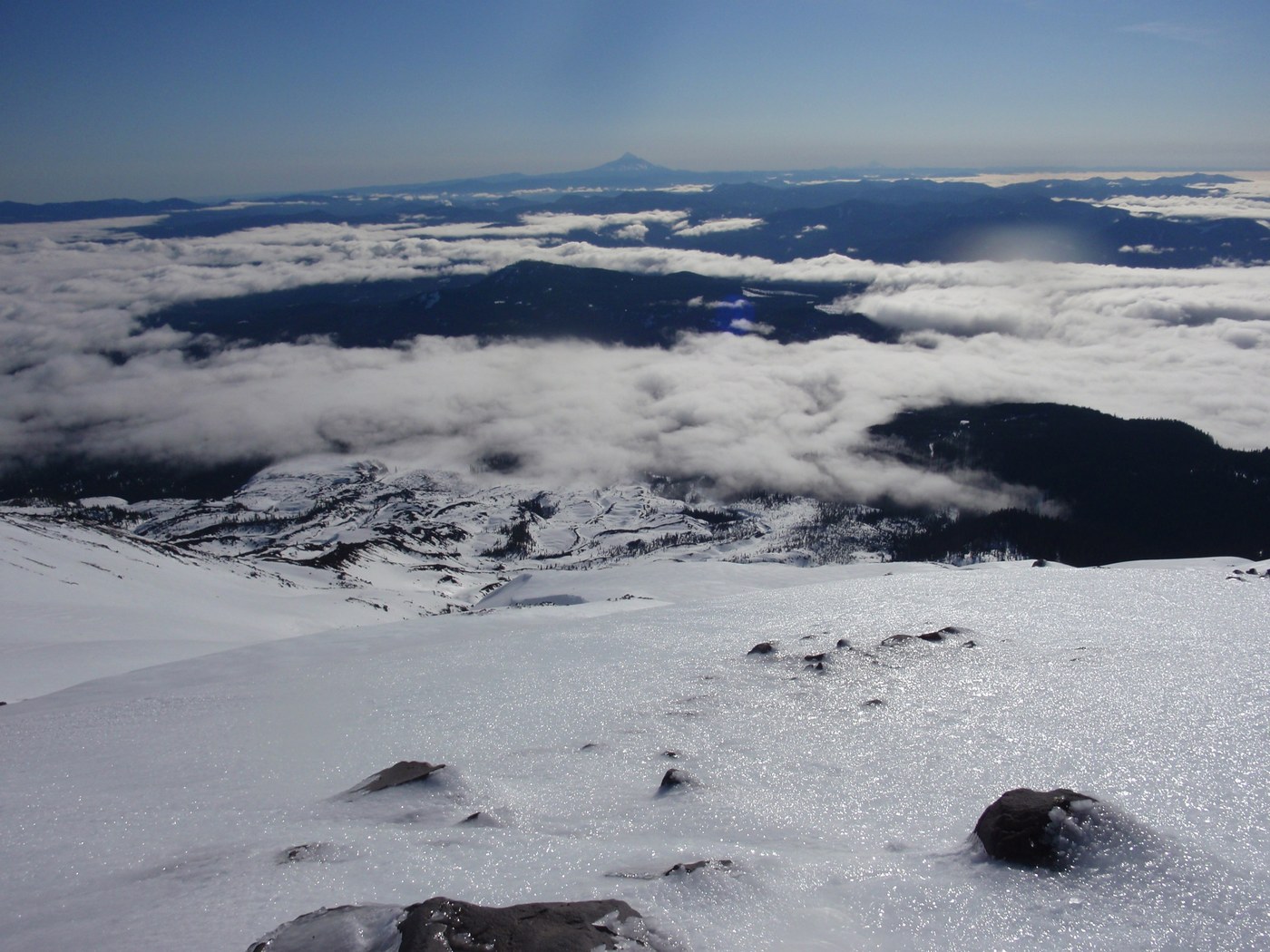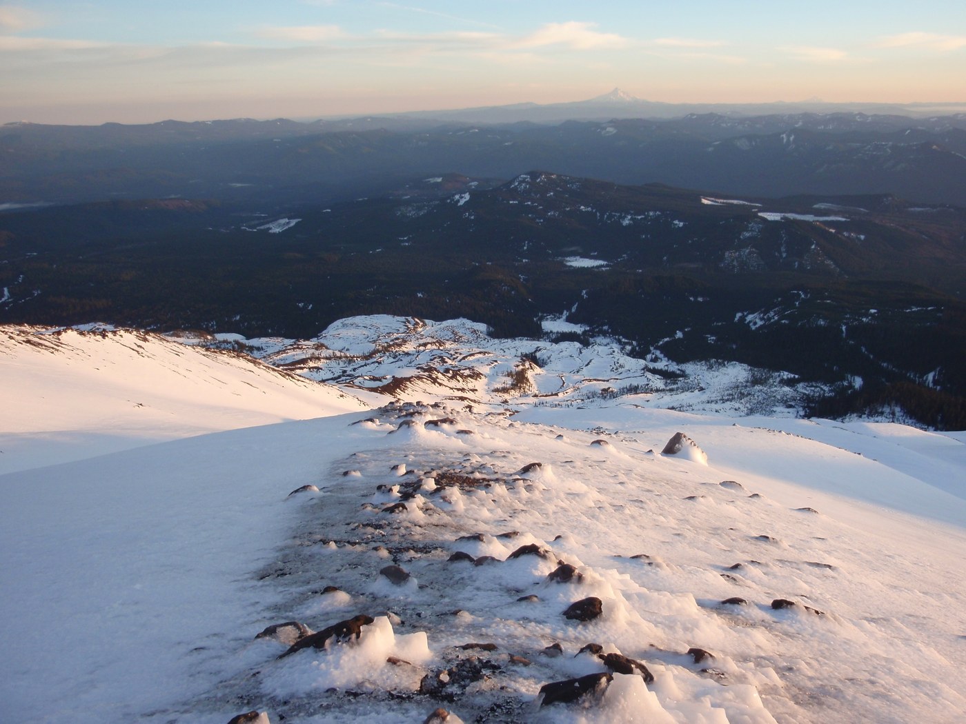 The setting sun pinked Mounts Adams and Hood and exposed Mount Bachelor, which had hidden all day, beyond. Coyotes howled at the rising moon behind the clouds at the summit of Adams.
