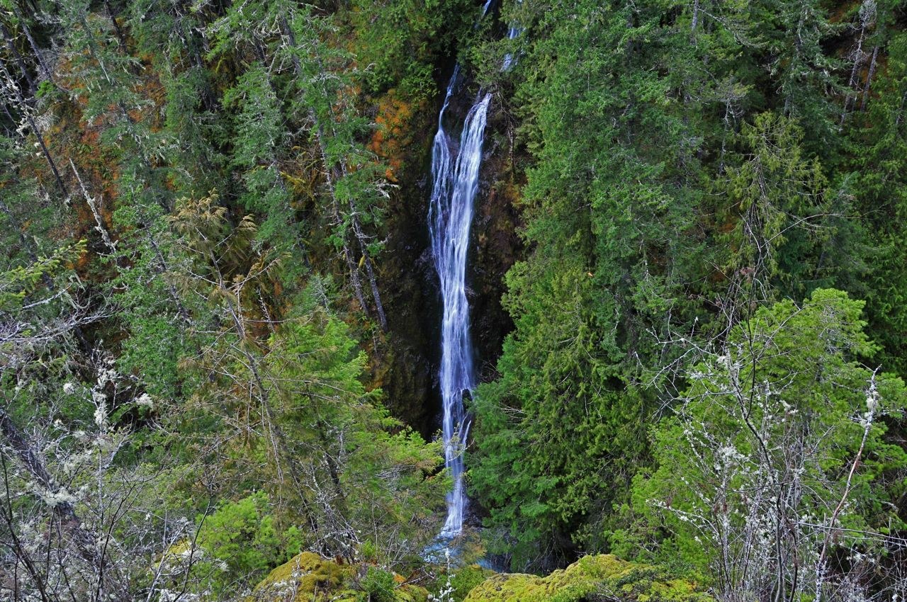We parked at the gated entrance to Fallsview CG and walked the short distance to the TH. To the right of the TH is a short loop trail which takes you to a view of the 100 ft falls across the canyon which tumbles into the Big Quilcene River below. The canyon trail loses 200 ft in .1 mile as it descends to the river. Here the trail begins to veer away from the river elevating gradually but always following the river through a lush green forest of maples lined with ferns and moss covered stumps. The river is beautiful with its many rapids and blue pools and its thundering sounds are ever present. At about 3/4 mile the trail veers left to ascend above the river to form a loop which ends at the trail.5 miles from the TH. This is a very pleasant 1.5 mile RT walk in the woods and doable with small children. 4 other groups including 2 small children were enjoying the beautiful day!