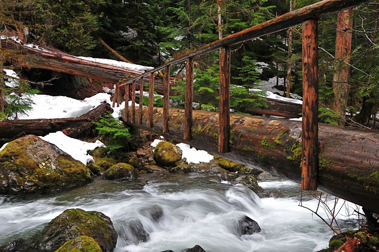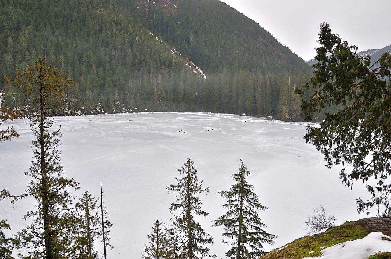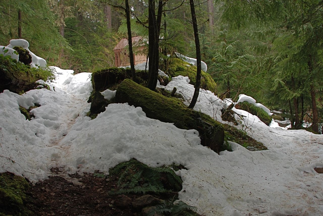 The road to the TH is snow free. We were the first to arrive at the TH, but were soon joined by a group of three. We would see only 4 other groups of day hikers plus 2 who were spending the night for a total of 19 people including us! The trail is mostly snow free with a short section of snow near the bridge which crosses Lena Creek where it flows underground. (We were on the trail a few years ago when there was water flowing over the mossy rocks! This was very pretty!) The most snow on the trail was the .5 mile section after the ledge which overlooks Lena Lake at 3 miles. 2 small creeks in this section were easily crossed. We had lunch at 3.5 miles by the bridge which crosses Lena Creek where it enters the lake. We put on our micro spikes after lunch to walk the snow. These were not necessary, but made walking easier.