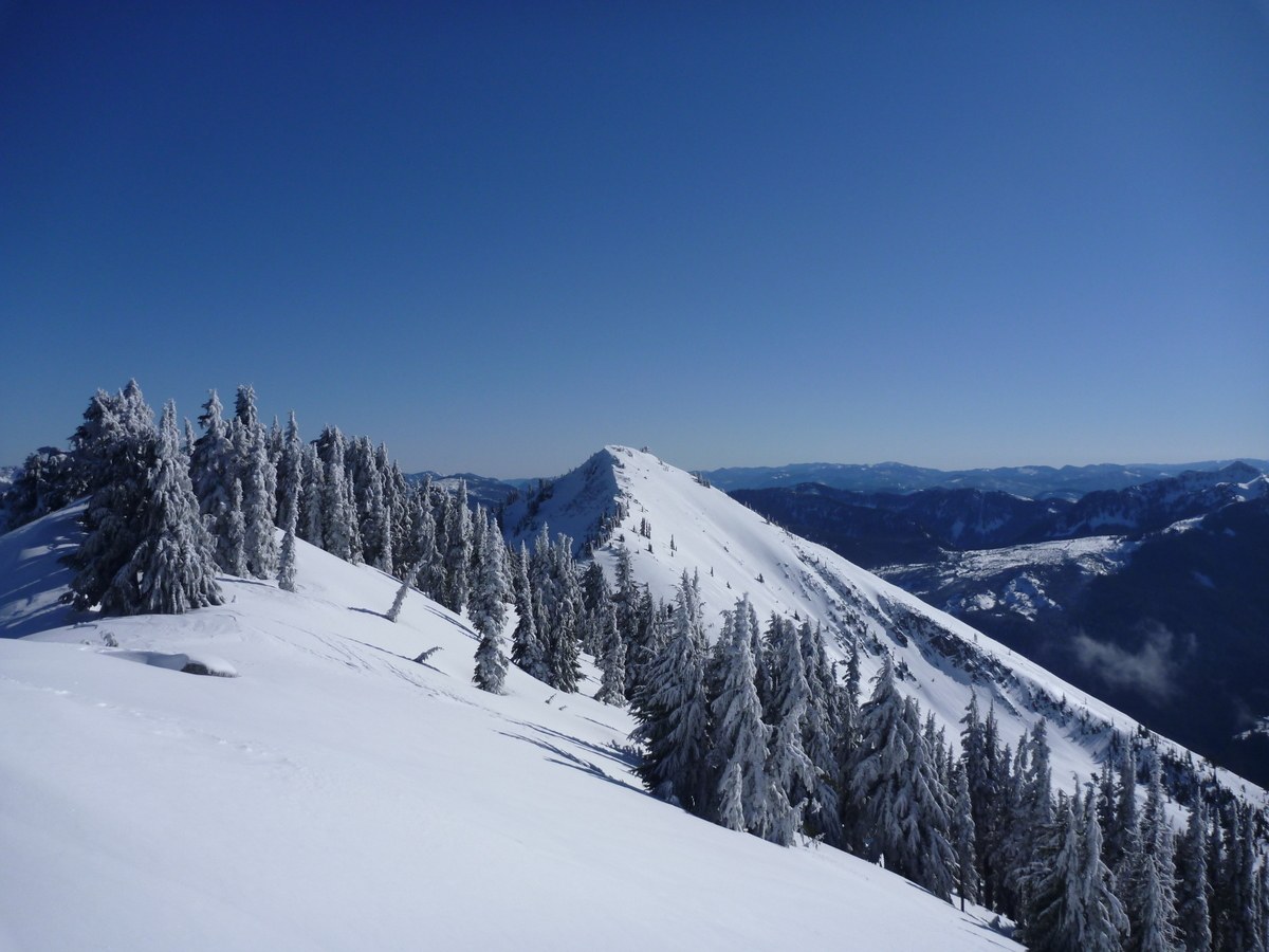 Did a loop, starting up the Pratt Lake trail, up West Granite's NW ridge, across to Granite. Missed the ridge with the winter route below Granite (easier to find when coming up), so we ended up having to cross an avalanche chute lower down, which might not be advisable under different conditions (or at all). First sprinkles of snow started at the junction with the Granite trail, increasing to a few inches over a solid base around Ollalie Lake. Beware of rocks covered with invisible ice at the stream crossings. The snow was never deep enough to bother with snowshoes. Instead I used microspikes on the lower trail, and crampons on the steeper slopes (which had a hard crust in places). Thanks to our late start (9:30) we encountered some spring-like slush on the way down, which made for difficult going on the steeper slopes.