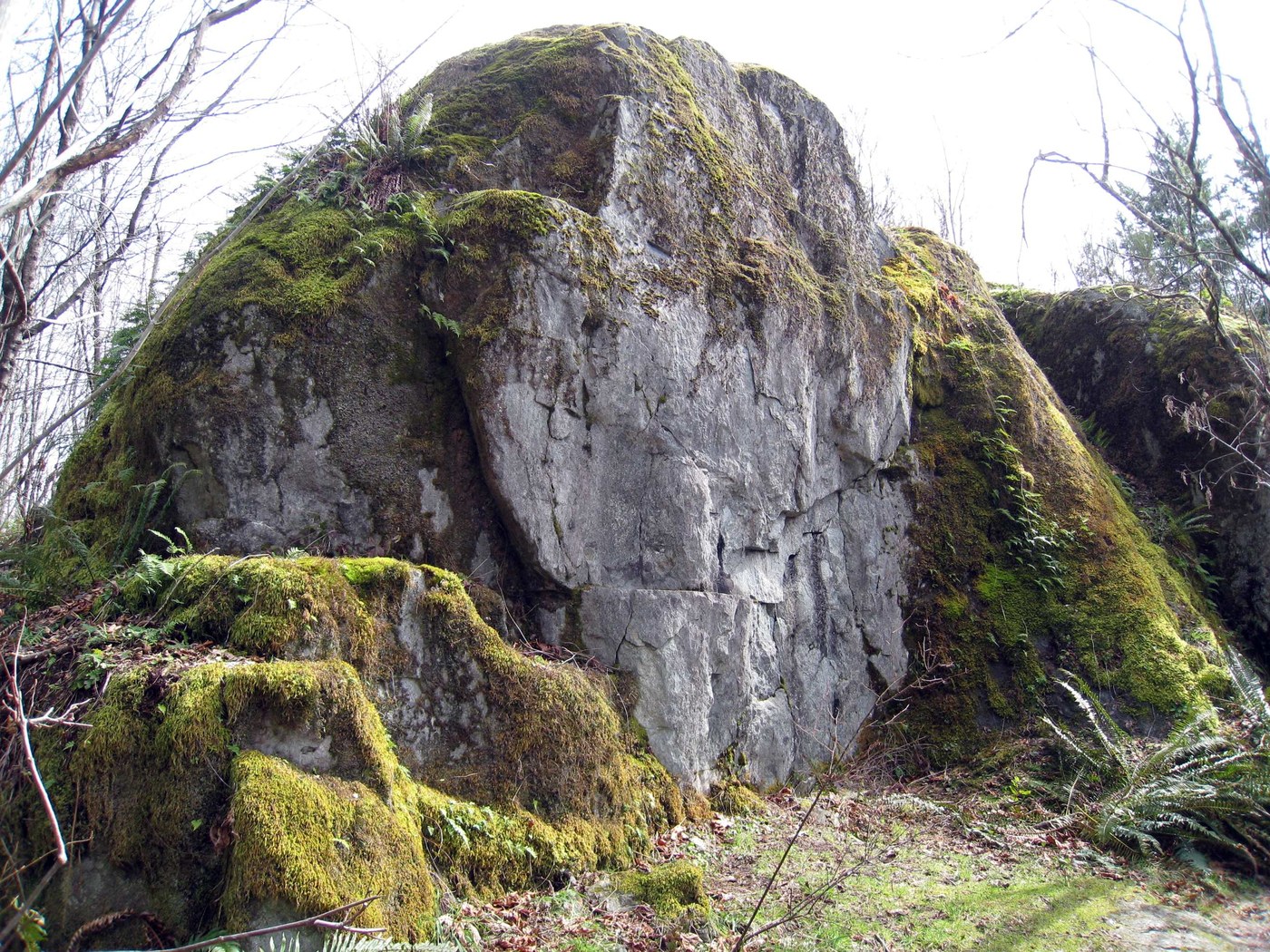 Start the Little Si trail and within 0.3M you will reach the first sign for the Boulder Garden Loop trail(1.5M). I continued on the Little Si trail for another 0.2M and at this point started the Boulder Garden Loop trail which is the north section of the trail. The trail increases in elevation and is green with trees, moss and lots of ferns. Eyes were peeled for boulders and soon they appeared. Large boulders, huge boulders and unfathomable boulders along the trail. The sky seemed to disappear as the trail took you through the forest with boulders on each side of the trail.