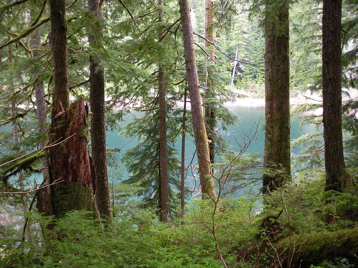 This was a fantastic hike! We ran into a few people who were partying at the campsite at the midpoint of the lake, but other than that, there was no one around. There are three or four trees across the trail but nothing you can't easily climb over. There's one spot in the marshy area where the shrubs are encroaching on the trail a little, but otherwise it is very well maintained. There are several very nice bridges on the far side of the lake as well. The old growth forest is very beautiful, and there are some huge trees.