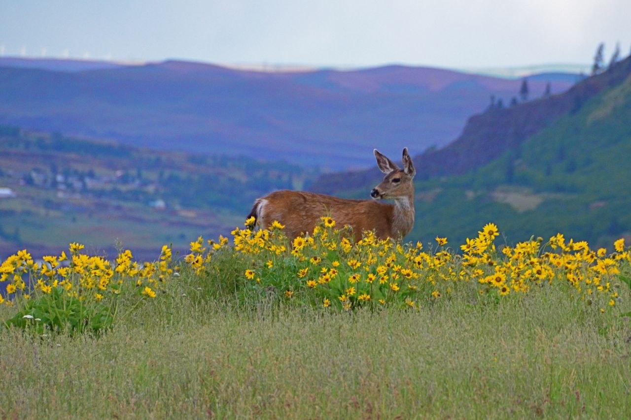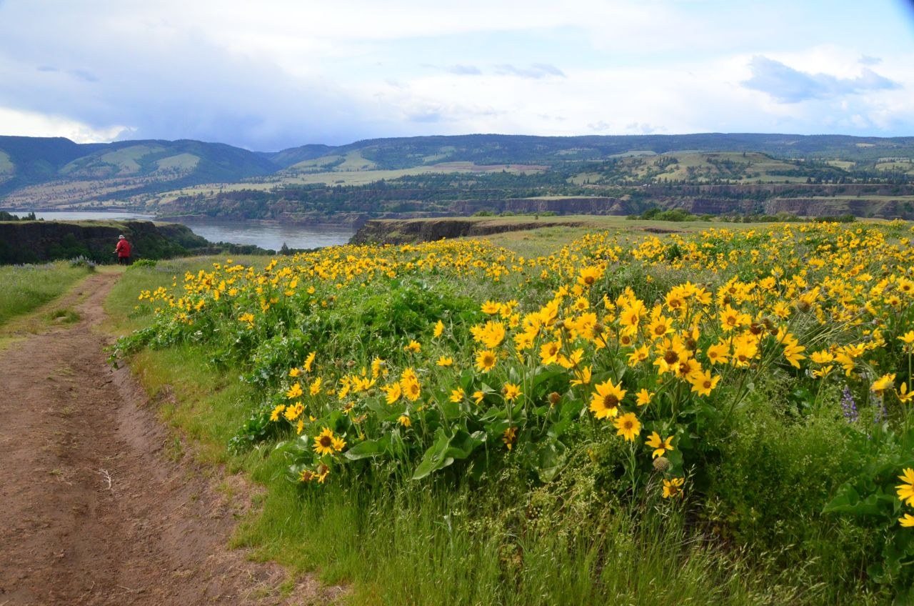 After hiking Mosier Twin Tunnels we drove to Rowena Plateau to see the flowers. To reach the TH drive I-84 to exit 69 for Mosier. Continue east on US 30 for 6.6 miles to Rowena Crest Viewpoint. We spent an hour walking in the area. The lupine and balsamroot were fading but were still pretty from a distance. Wild cucumber, Hood River Milk Vetch, Bicolored Cluster Lilies, and Bachelor's Buttons were also seen.