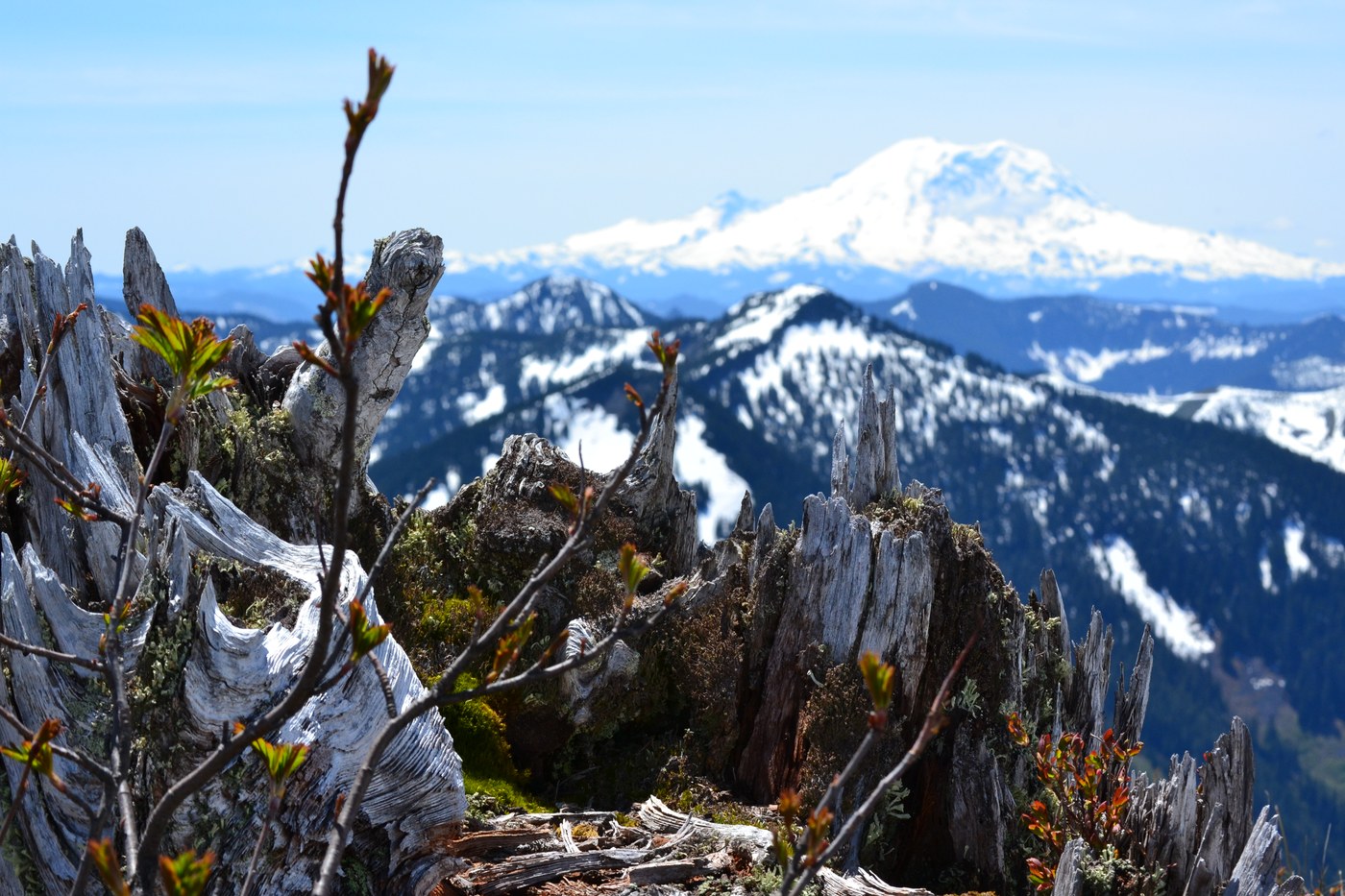 It was a gorgeous day to hike Granite Mtn, blue bird skies in all directioins. I reached the trailhead at 9am, right as a WTA work party was getting ready to set out on the trails (thanks!). For the first 2.5 or 3 miles I was completely alone on the trail. Trail conditions in the wooded areas were great, very dry until later in the day (on the way down) when snow melt must have picked up and created a couple slighly muddy areas, not bad at all though. Once it opened up to the traverse, moving east, through the meadows I started running into more folks, on their way down. While I only saw a few trilliums here and there, I did notice a lot of flower buds during this stretch of the trail, so in a few weeks the wild flowers could be out and it would be fantastic. The last section of the hike, when the trail bends NW after the traverse, is completely covered in snow. It is very well tracked out, I had no problem following the route. I made it up and down fine with my "light hiking" shoes alone, although lot of people had trekking poles and gators-- which might be a good idea if you have them. The views were amazing-- not much I can say here. The route down is pretty fun if you don't mind slidding a little, very fun. All and all, it was a fantastic hike!!