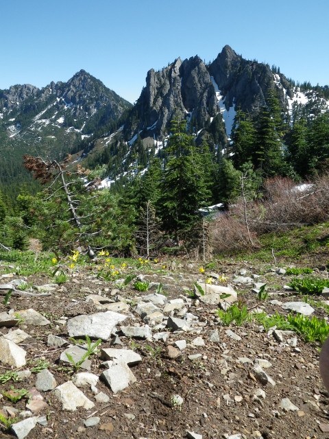 After the first half-mile, French Cabin Creek trail is covered with snow. I'd advise waiting until August to try this hike, unless you like routefinding. Although there are a few clearings where the sun has melted out the snow, the great majority of this trail is through forest, where the snow is deep - anywhere from two to five feet deep.