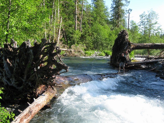 Between the crossing of the East Fork Foss R and Jade Lake, this trail is very rough, rocky, rooty, wet, with considerable blowdown and brush. A tough stretch of trail, with puncheon that looks like it dates to CCC days. I'll bet it was originally a mining trail, not engineered for posterity. But it's lovely. Some of the blowdown is very big, but one guy with a pruning saw could do a lot.