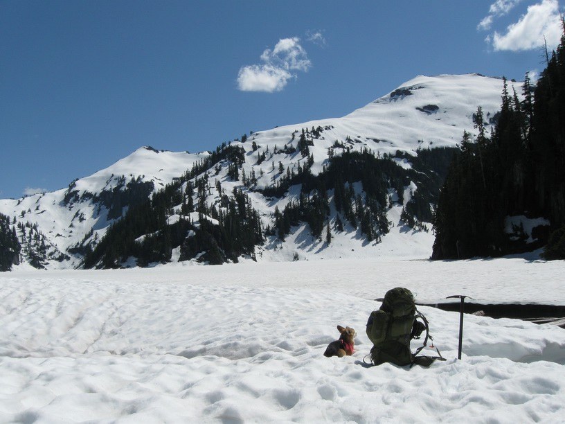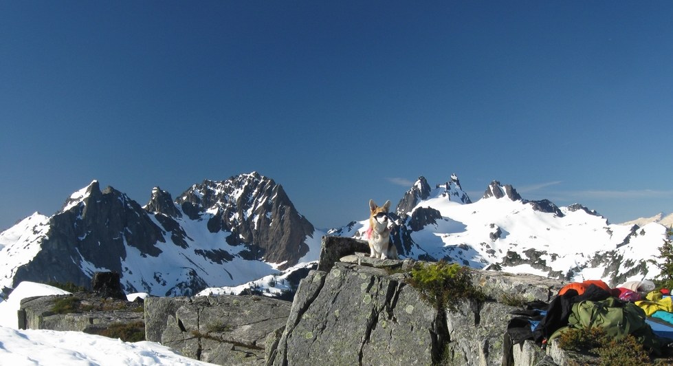 We jetted through Tank Lakes, went to Tahl Lake, and ascended W to the ridge up a snow bowl with safe runout. Otter Point 6359 was about the first dry ground we saw that day, and I bivvied on the benchmark (perk of going solo: you don't need a big campsite). Sunset through roiling mists, then it cleared to a starry night, no tent, and cloudless dawn. Nice to have a dog that fits in the sleeping bag. One of the best days I've spent outdoors. The view from this modest summit (an easy scramble) makes it really hard to leave.