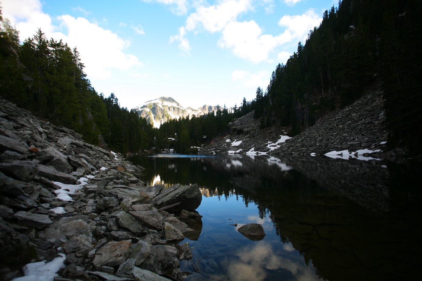 The snow starts at 4600' when you hit the first Necklace Lake, Jade Lake. Cross the sunbleached log at the inlet of Jade Lake to find the trail. I was able to follow other's snow tracks easily. There's only one dry campsite in the middle of Emerald Lake that I saw. Camp at your own risk (see bear warning above). There's also a hikers log cabin, but the wet floor makes it pretty un-enticing.