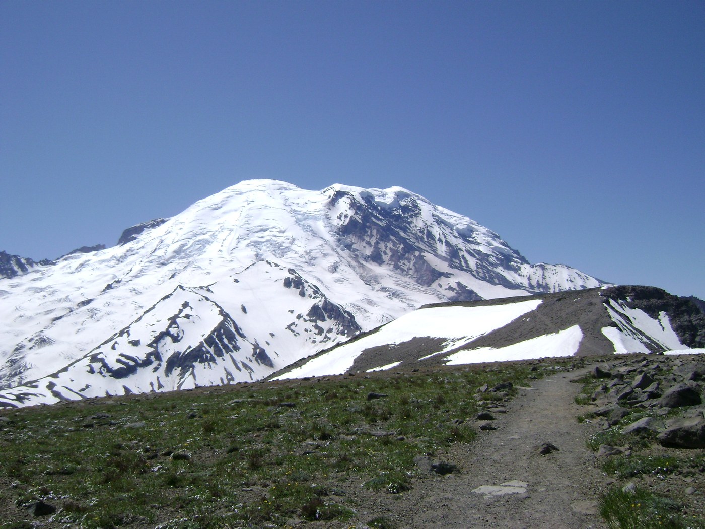 The trail from First to Second Burroughs has a little bit of snow on it in places, but pretty minor compared to the Frozen Lake to First Burroughs segment. We spent about an hour on top with only two other hikers, very quiet for a beautiful Saturday. On the way out from Frozen Lake to Sunrise I counted over 125 people coming up the trail; the tennis shoe and shorts crowd had arrived.