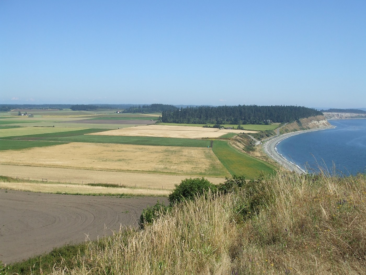 Follow the beach back until you get to a pit toilet and parking area. You pick the trail back up to the bluffs here. Head left up the trail until you reach the T junction that took you over the bluffs. Turn right to head back past the homestead and to your car. This loop is 5.6 miles long. If you wanted to do just the shorter loop from the beach up on the bluffs and back there is a parking area on Ebey's Landing road. This will cut about 2 miles off the total.